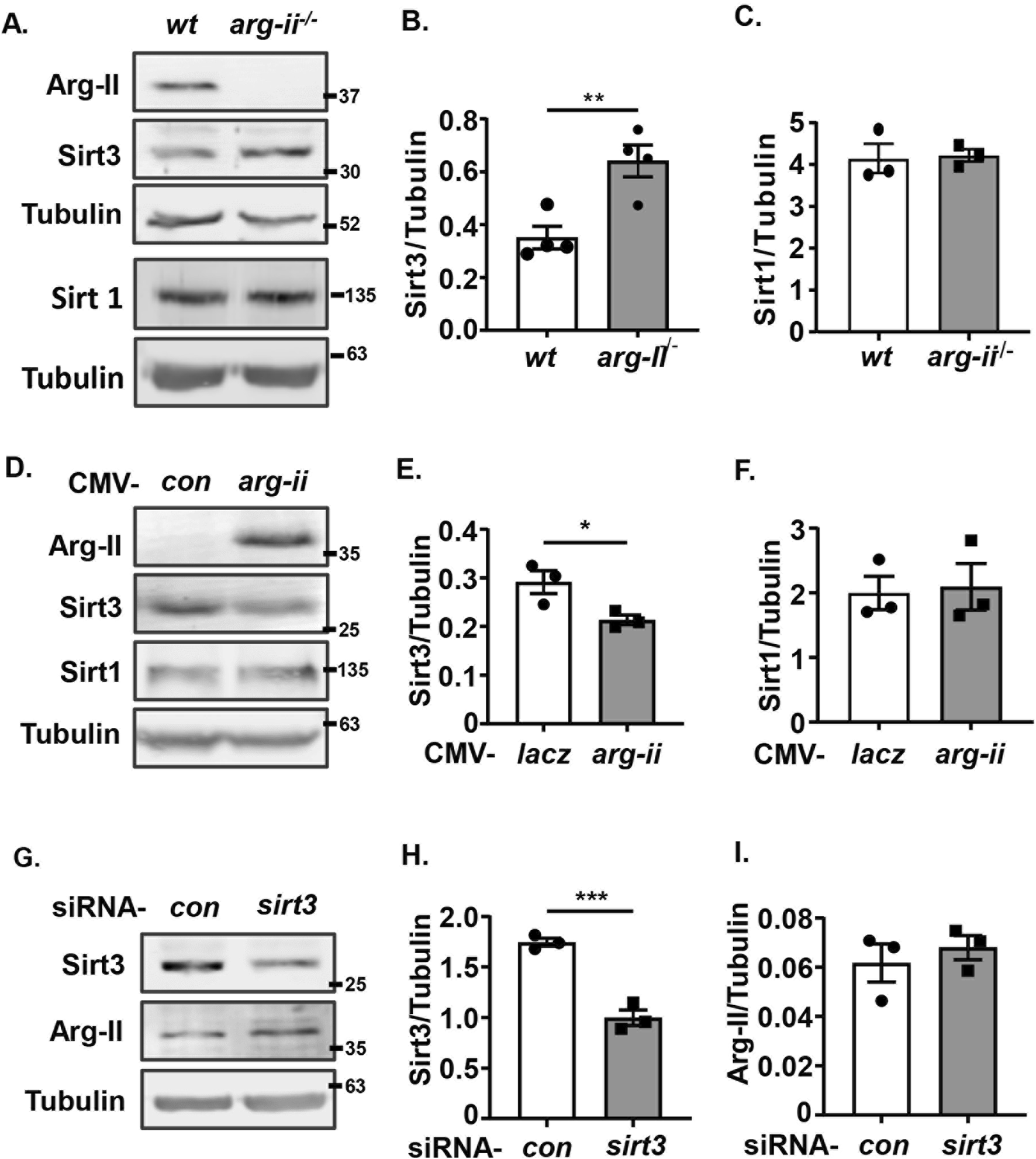 Arg-II suppresses Sirt3 expression. Immunoblotting analysis of Arg-II, Sirt3, Sirt1 with lysates prepared from (A–C)wt and arg-ii−/− Me276 cells (n = 4), (D–F)arg-ii−/− Me276 cells transduced with rAd-CMV-lacz (Con) or -arg-ii (arg-ii), (G–I)wt Me276 cells transfected with scrambled control siRNA or siRNA-sirt3 for 48 h (n = 4). Tubulin served as loading control. The graphics on the right present the quantification of the results shown in the corresponding left panels. *p < 0.05, *p < 0.01, ***p < 0.001 between the indicated groups.