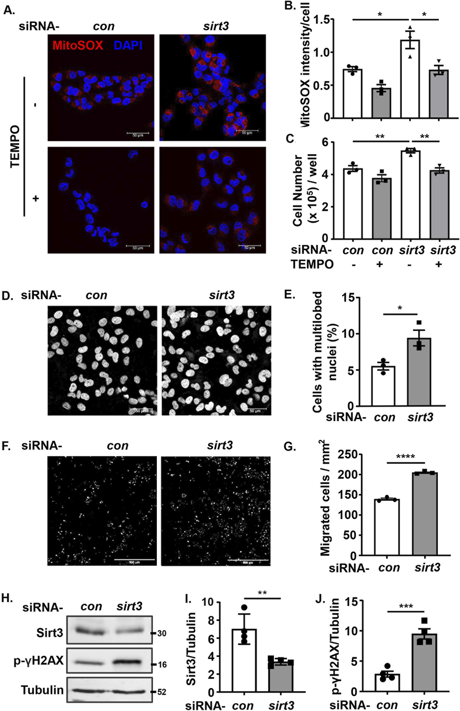 Silencing Sirt3 promotes melanoma growth and malignancy by enhancing mtROS. wt Me276 cells were transfected with scrambled control siRNA or siRNA-arg-ii, 24 h post-transfection, TEMPO (10 umol/L) was added to the cells and removed after 1 h. The cells were further cultivated for another 24 h, and then subjected to following analysis. (A) MitoSox staining (red). Scale bar: 50 µm. (B) Quantification of the mtROS signals shown in A (n = 3). (C) Cell number per well counted with the Neubauer cell counting chamber and presented as cell number/well (n = 6). (D, E) DAPI staining (white) to assess the nuclei deformation. Scale bar: 50 µm. (F, G) trans-well migration assay. Scale bar: 500 µm. (H–J) immunoblotting analysis of Sirt3 and p-γH2AX-S139. Tubulin served as loading control. The graphics on the right present quantification of the signals in the corresponding images or blots. *p < 0.05, **p < 0.01, ***p < 0.001, ****p < 0.0001 between the indicated groups.