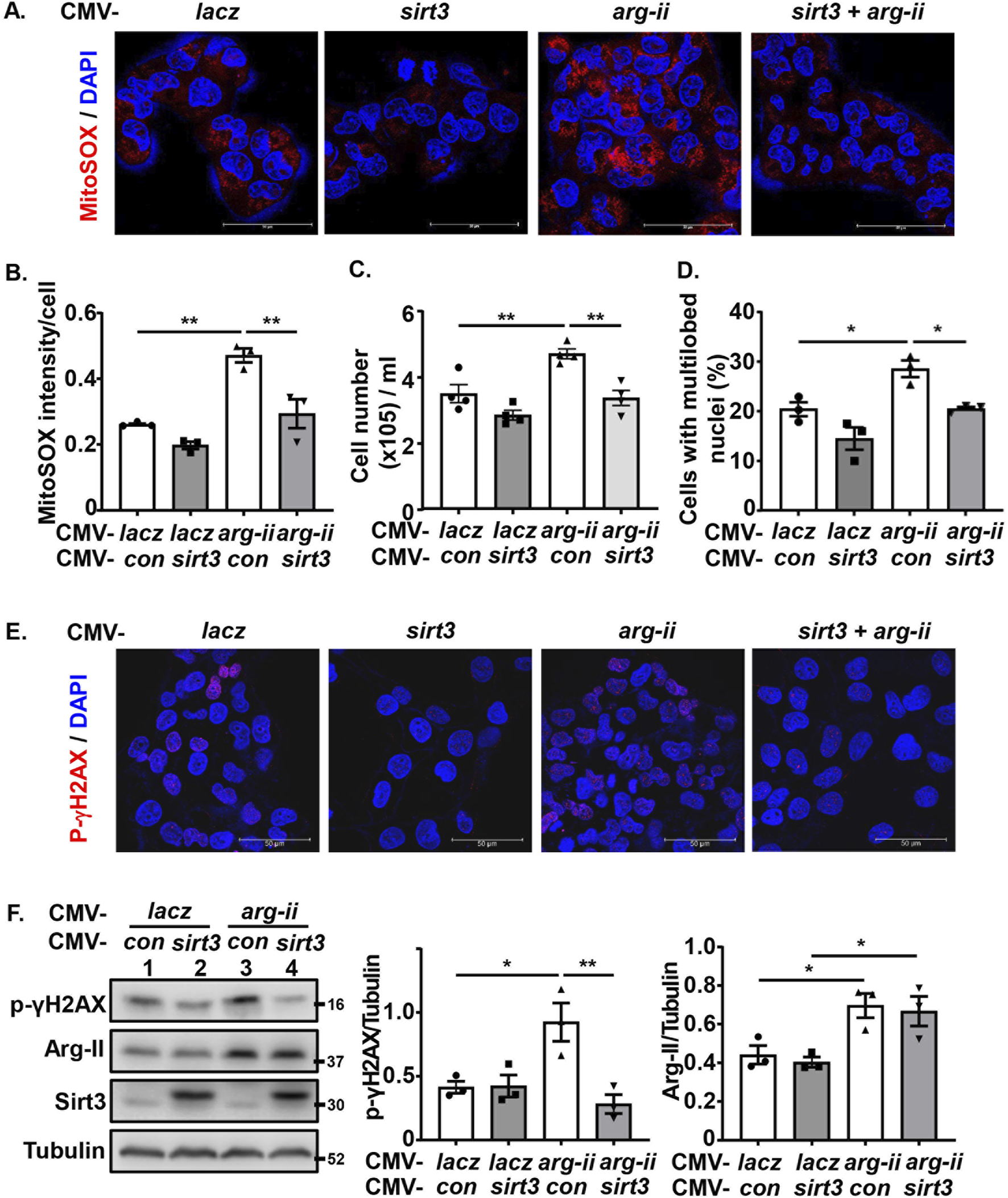 Arg-II induces mtROS generation, cell growth and malignancy through suppressing Sirt3. wt Me276 cells were transfected with plasmid CMV-control or -sirt3 to overexpress Sirt3. 24 h post-transfection, cells were transduced with rAd-CMV-lacz (used as control) or -arg-ii. 48 h post transduction, following analysis was performed. (A, B) MitoSox (red) and DAPI (blue) staining. (C) Cell number/well counted with the Neubauer cell counting chamber. (D) From the images shown in 7A, (C) and % of the cells with multi-lobed nuclei (D) were counted. (E) DNA damage assessed by immunostaining for p-γH2AX-S139 (red) followed by DAPI staining (blue). (F) Immunoblotting analysis of p-γH2AX-S139, Arg-II and Sirt3. Tubulin served as loading control. Scale bar: 50 µm. *p < 0.05, **p < 0.01, ***p < 0.001 between the indicated groups.