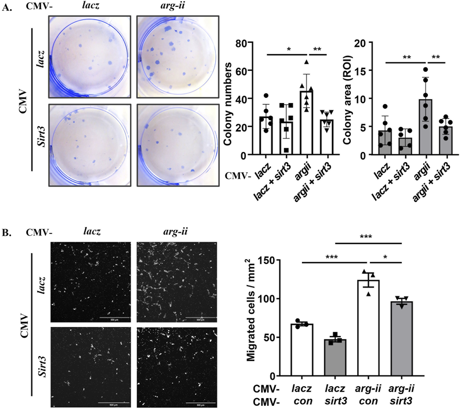 To demonstrate that Arg-II promotes mtROS production resulting in increased cancer cell malignancy indeed through suppression of Sirt3, sirt3 was co-overexpressed with arg-ii in melanoma cells. sirt3 overexpression prevented arg-ii overexpression-indued increase in mtROS generation (Figures 7A, B), cell number (Figures 7A, C), the percentage of cells with multi-lobed nuclei (Figures 7A, D). Moreover, Arg-II-induced DNA damage as monitored by p-γH2AX-S139 (Figures 7E, F), the increase in colony formation (Figure 8A) and migration (Figure 8B) induced by arg-ii overexpression were prevented by sirt3 co-overexpression. Similar results were obtained in A549 lung cancer cells (Supplementary Figure S8). These data provide evidence that Arg-II suppresses Sirt3 leading to enhanced mtROS production, which in turn promotes melanoma growth and malignancy.