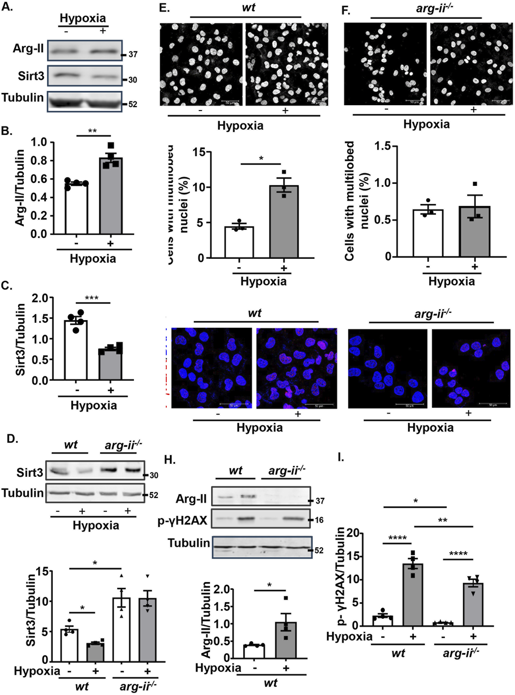 Hypoxia suppresses Sirt3 and induces nuclear deformation and DNA damage through up-regulating Arg-II. wt and arg-ii−/− Me276 cells were exposed to normoxia (21% O2) or hypoxia condition (1% O2) for 72 h and then subjected to Confocal microscopy cell imaging analysis and Immunoblotting analysis. (A–C) Immunoblotting analysis of Arg-II and Sirt3 in wt Me276 cells. (D) Immunoblotting analysis of Sirt3. (E–F) Immunofluorescence staining with DAPI (white). (G) Immunostaining for p-γH2AX-S139 (red) followed by the counter stain of nuclei with DAPI (blue). (H, I) Immunoblotting analysis of Arg-II, p-γH2AX-S139. Tubulin served as loading control. Scale bar: 50 µm. Quantification of the signals in images shown in (A, D–H) are presented as graphics in the corresponding figures (n = 4). *p < 0.05, **p < 0.01, ***p < 0.001, ****p < 0.0001.