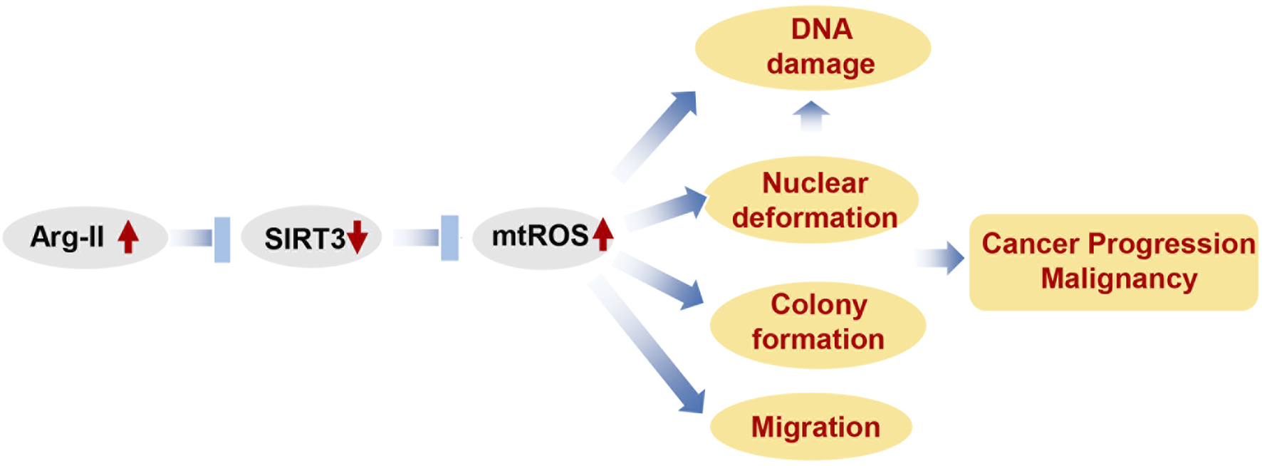 Schematic summary of how Arg-II promotes cancer progression. Elevated Arg-II in cancer cells suppresses Sirt3 leading to enhanced mtROS production. mtROS promotes cancer growth, DNA damage and nucelear deformation. Nuclear deformation in turn promotes migration as well as inducing DAN damage. All these contribute to cancer progression and malignancy.