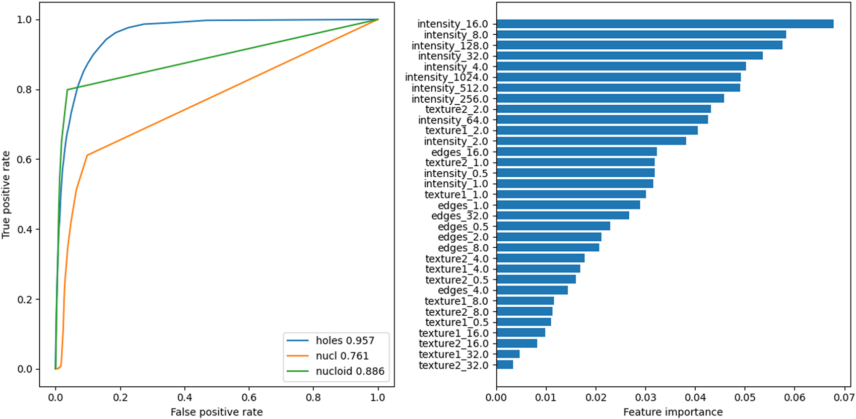 The HT image analysis was performed to characterize the observed subcellular circular structures that were classified as pore-like structures (Figures 1a–d). The images were exported and analyzed by a random forest classifier Pedregosa et al. (2011). This classifier was trained on features computed on 6 crops of HT images containing