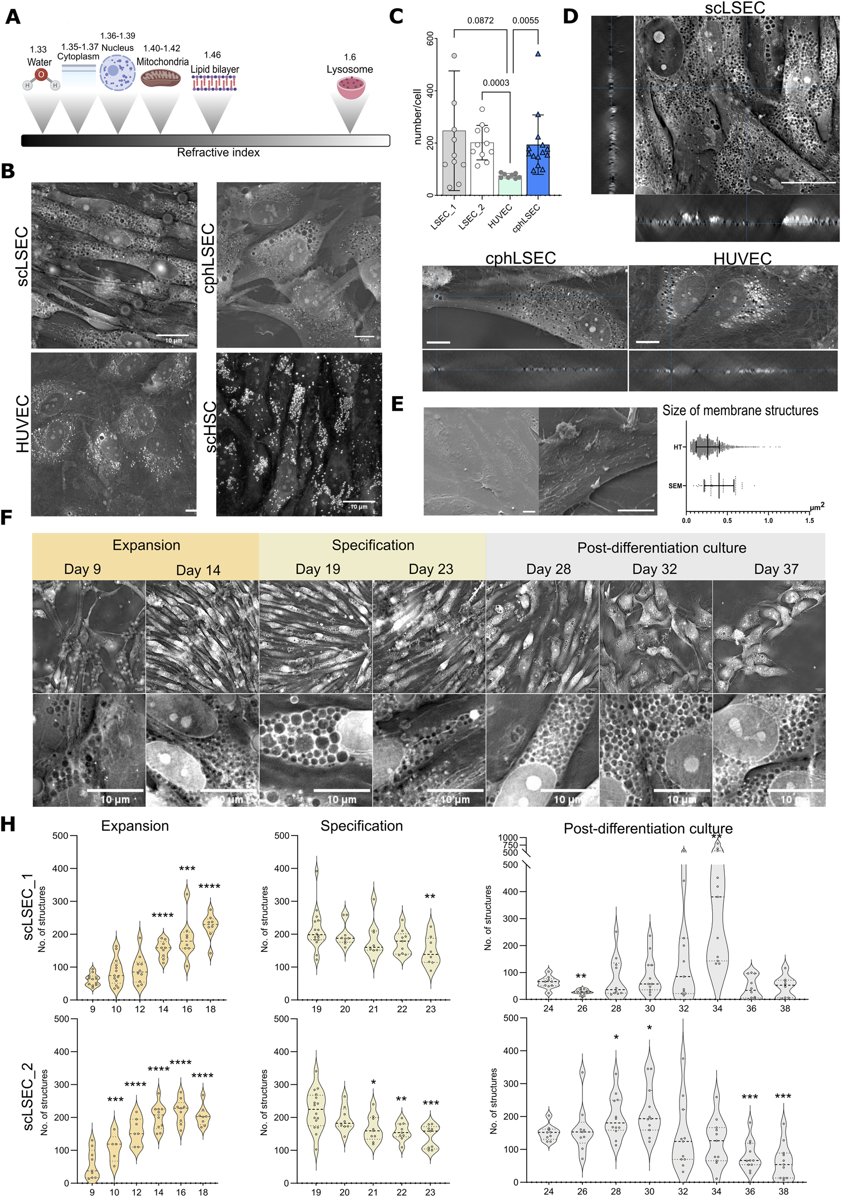Figure 4. Holotomography (HT) imaging of scLSECs during expansion, specification and post-differentiation culture. (A) Scheme showing refractive indexes of cellular components. (B) Representative HT images of scLSEC, cphLSEC, HUVEC and stem cell-derived hepatic stellate cells (scHSCs) to visualize and differentiate cell type-specific features. Scale bar = 10 µm. (C) Number of pore-like structures in scLSECs, cphLSEC and HUVECs. Statistical test: one-way ANOVA test, N = 8–14 images. (D) Orthogonal view of Z-stacks of scLSEC, cphLSEC and HUVECs, demonstrates the presence of pore-like structures spanning through the whole thickness of cells. (E) Representative scanning electron microscopy (SEM) images of scLSEC (left) and cphLSEC (right). Scale bars = 10