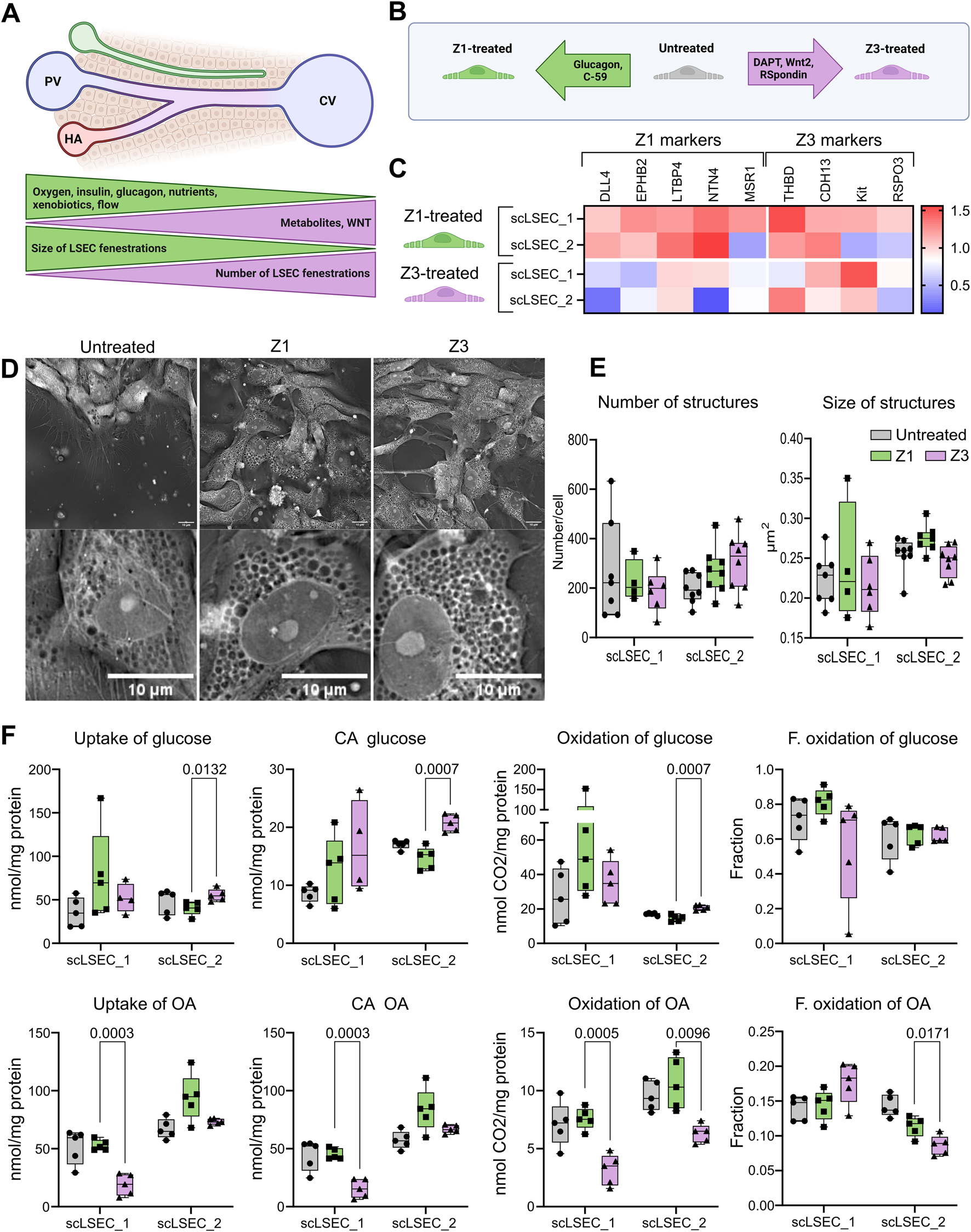 The zonation of non-parenchymal liver cells is a relatively recent discovery Su et al. (2021) and the possibility of in vitro induction of zone-specific identities in LSECs is, hence, an understudied topic. Here, we attempted to induce Z1-and Z3-like identities in the scLSECs by treatments with nutrients and signaling molecules characteristic of the respective zones with modestly optimistic results (Figure 5). We observe that the Z1 markers displayed a pattern of general increase during the Z1 treatment, consisting of glucagon and C-59, and decrease during the Z3 treatment, consisting of DAPT, Wnt2, and R-Spondin 3 (Figure 5C), indicating the induction of zonal identities. Additionally, we detected treatment-induced changes to the energy metabolism. The metabolism of glucose can be used to assess glycolysis, a low-energy metabolic process most common in Z3 Cunningham and Porat-Shliom (2021). Correspondingly, we observe an increase in glucose uptake and subsequent CA glucose and glucose oxidation in the Z3-treated scLSEC_2 line. Importantly, the metabolism of OA can be used to assess