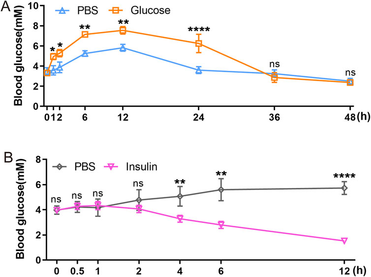 GTT and ITT approach are standard methods for assessing glucose metabolism and insulin response. We employed intraperitoneal GTT and ITT to characterize these processes in axolotls. Assessing these processes in smaller models like zebrafish is challenging, so it is particularly relevant to determine their feasibility in axolotls. We initially followed established procedures used in mice (Cassano et al., 2020; Qu et al., 2019; Zhu et al., 2021b), but noted unexpected fluctuations in glucose and insulin levels during the measurement periods. Considering the evidence of the slower glucose metabolism in axolotls suggested by sequencing data, we optimized our experimental protocols for intraperitoneal GTT and ITT. Blood glucose levels were measured at various time points: 0, 1, 2, 6, 12, 24, 36 and 48 h following a 2 mg/g glucose injection during GTT (Figure 5A). In comparison to blood glucose measurement sampling in mice (Small et al., 2022), the intervals for measurements in axolotls are longer. Our findings revealed that the average fasting blood glucose level in adult axolotls was 3.317 ± 0.419 mmol/L 12 h after an intraperitoneal injection of glucose (2 mg/g), blood glucose levels rose to 7.55 ± 0.369 mmol/L. By 36 h post-injection, glucose levels returned to basal level (2.867 ± 0.486 mmol/L). ITT was performed on 6 h fasted axolotls. 5 μL/g insulin glargine was injected into the axolotl, and blood glucose levels were measured at 0, 0.5, 1, 2, 4, 6 and 12 h after insulin injection (Figure 5B). The results showed that blood glucose levels decreased from 3.962 ± 0.134 mmol/L at baseline to 1.525 ± 0.207 mmol/L at the 12-h mark, where levels stabilized. In summary, axolotls exhibit lower blood glucose homeostasis compared to mammals, aligning with the notion that blood glucose levels correlate positively with metabolic rates (Simon et al., 2019; DeFronzo et al., 1979). This aligns with gene expression analysis and further indicates slower glucose metabolism in axolotls.