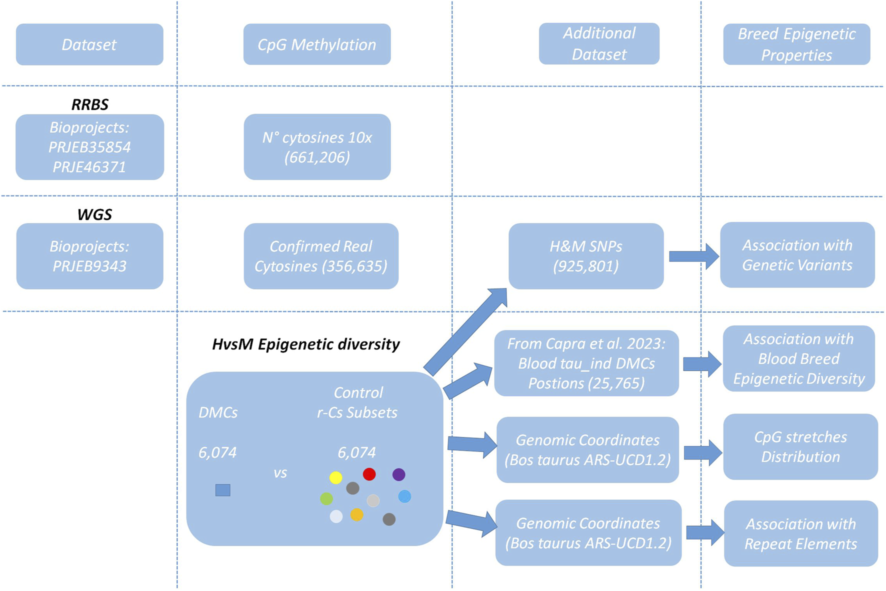 This study utilized public RRBS raw fastq sequences from Bioprojects PRJEB35854 and PRJEB46371 to assess sperm epigenetic diversity between H and M breeds. To distinguish with confidence between genomic thymines and unmethylated cytosines (which are read as thymines in bisulfite sequencing), we also included the Bioproject PRJEB9343 dataset containing whole genome sequencing (WGS) raw fastq sequences from animals from same breeds (Boussaha et al., 2015). This dataset allowed also the identification of genetic variation between the two breeds, which was superposed to the methylated cytosines dataset to remove positions overlapping SNPs. The remaining CpGs were used to find breed specific differentially methylated cytosines (DMCs). In order to thoroughly investigate breed epigenetic diversity, we generated 10 sets of randomly selected (excluding DMCs) control cytosines (r-Cs), which were used to validate the estimation of the occurrence of epigenetic variation in proximity of genomic positions associated to animal genetic variation, cattle subspecies blood epigenetic diversity, and repetitive elements. Figure 1 displays the study workflow.