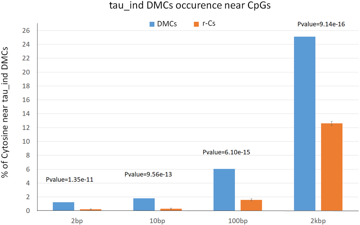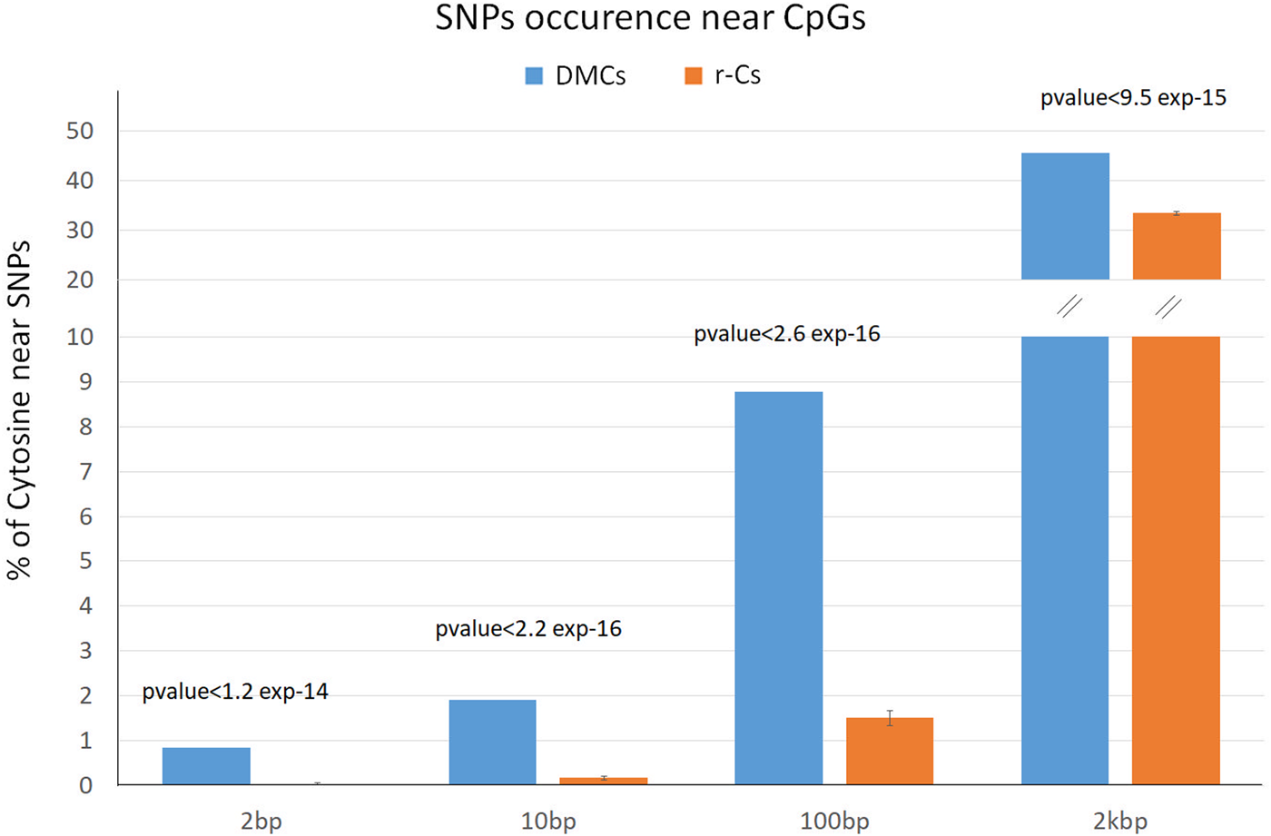 Percentage of differentially methylated cytosines (DMCs, blue) and SNP free cytosines (r-Cs, orange) near subspecies-specific differentially methylated cytosines (DMCs between Bos taurus and Bos indicus: 2 bps, 10 bps, 100 bps, 2 kbs from a SNPs position).