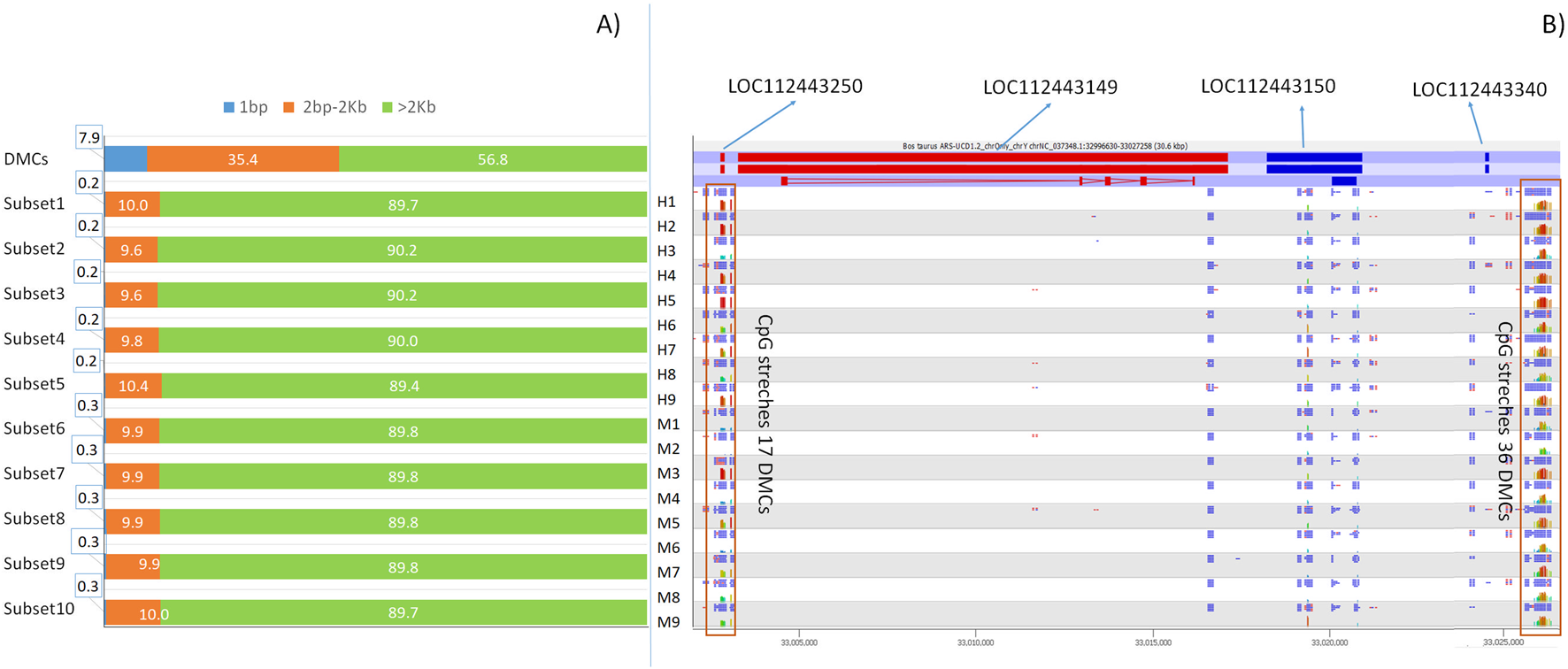 (A) Percentage of CpGs according to the proximity to the next CpG (1 bp, between 2 bps and 2 kbs and more than 2 kbs) for DMCs and the ten random r-Cs subsets. (B) The Bos taurus ARS-UCD1.2 NC_037348.1:32996630-3027258 region and the level of methylation in 9 H and 9 M animals for DMC stretches (DMCs distance from the adjacent cytosine below 2 kbs) encompassing LOC112443250 and LOC112443340 5S rRNA genes, which surround LOC112443149 and LOC112443150, codifying liprin-alpha-1-like and S-antigen like proteins.