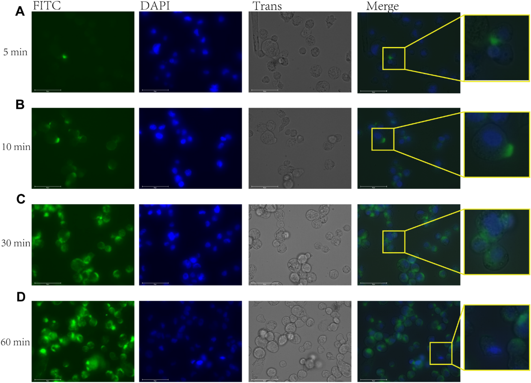 FITC-rFIP-nha taken up by THP-1 macrophages, with FITC-rFIP-nha shown on FITC channel (green), Hoechst stained nuclear acids shown on DAPI channel (blue), and cell image shown on Trans channel. The FITC-labelled rFIP-nha that was not taken up from the media was quenched using trypan blue. (A) FITC-rFIP-nha taken up by THP-1 macrophages in 5 min; (B) 10 min; (C) 30 min; (D) 60 min.