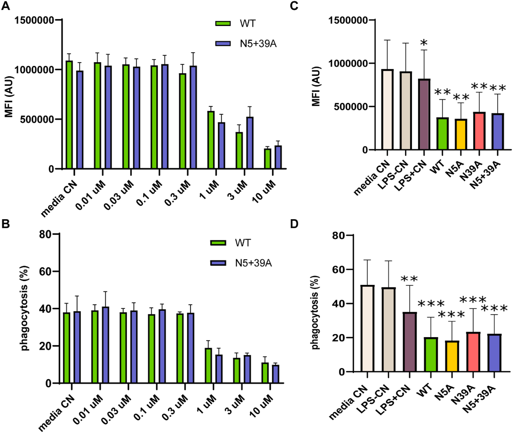 rFIP-nha decreases THP-1 macrophage phagocytosis of fluorescently labelled Escherichia coli. (A) the amount of Escherichia coli particles consumed by each THP-1 macrophage after treatment with WT or N5+39A for 16 h in a concentration range from 0.01 µM to 10 μM, measured as MFI; (B) the percentage of THP-1 macrophages that phagocytosed Escherichia coli particles after treatment with WT or N5+39A for 16 h in a concentration range from 0.01 µM to 10 μM; (C) the amount of Escherichia coli particles phagocytosed by each THP-1 macrophage treated with 10 μM WT, N5A, N39A or N5+39A for 16 h, measured as MFI; (D) the percentage of THP-1 macrophages that phagocytosed Escherichia coli particles after treatment with 10 μM WT, N5A, N39A or N5+39A for 16 h. The highest LPS content of rFIP-nha and its mutants was considered as LPS-CN; 1 μg/mL LPS was used as LPS + CN; medium was used as non-treated control (Media CN). All values were compared to media CN, with *p < 0.1, ** p < 0.01, *** p < 0.001, ****p < 0.0001.