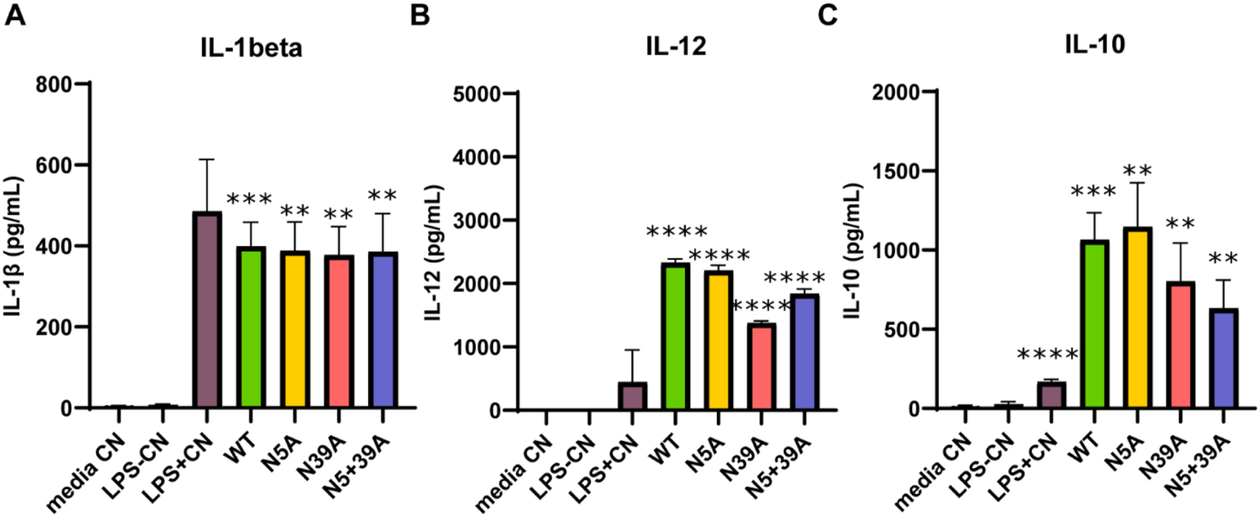 Cytokine secretion of THP-1 macrophages treated with rFIP-nha and its mutants. The highest LPS content of rFIP-nha and its mutants was added as LPS-CN; 1 μg/mL LPS was added as LPS + CN (M1); media CN were exposed to just medium; macrophages were exposed to 10 μM of rFIP-nha and its mutants for 16 h. (A) IL-1β secretion of THP-1 macrophages treated with rFIP-nha and its mutants; (B) IL-12 secretion of THP-1 macrophages treated with rFIP-nha and its mutants; (C) IL-10 secretion of THP-1 macrophages treated with rFIP-nha and its mutants. All values were compared to media CN, with ** p < 0.01, *** p < 0.001, ****p < 0.0001.