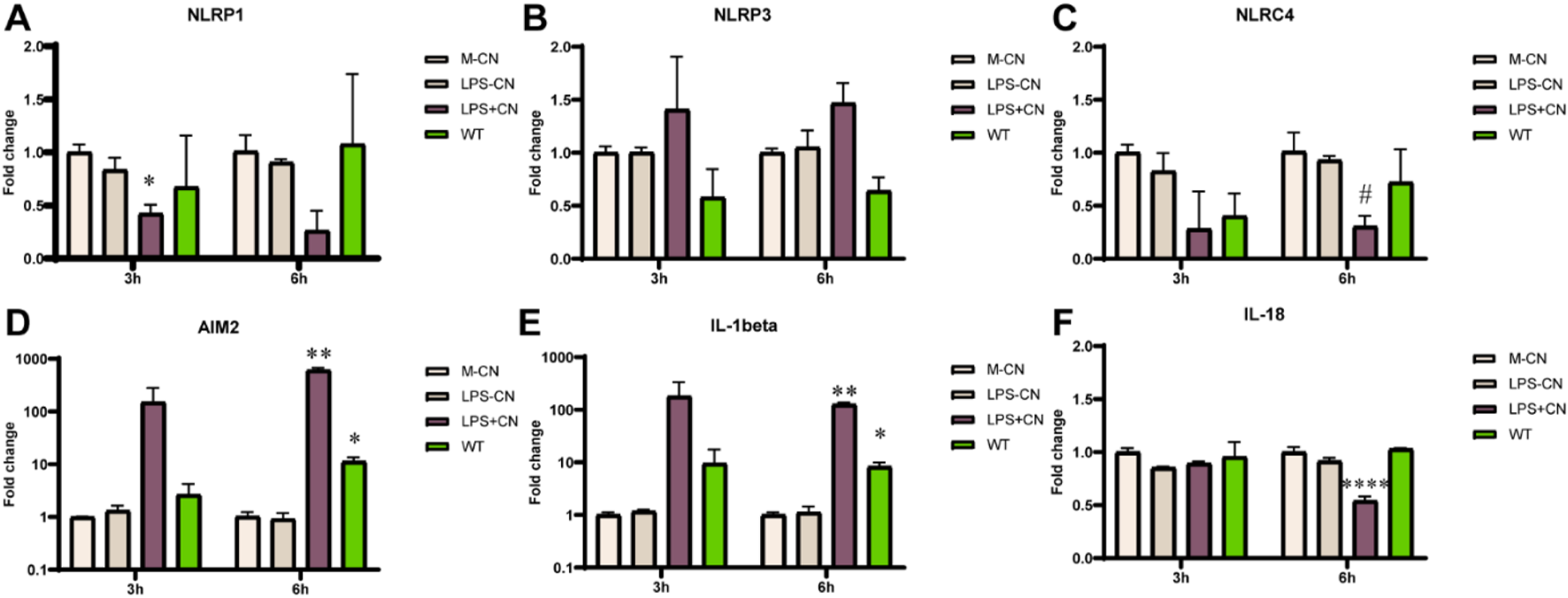 THP-1 macrophage gene expression of inflammasomes, IL-1β and IL-18 after rFIP-nha (WT) treatment. The LPS content of rFIP-nha was added as LPS-CN; 1 μg/mL LPS was added as LPS + CN (M1); Medium-treatment was included as non-treated control (M-CN). THP-1 macrophages were exposed to 10 μM of rFIP-nha for 3 h and 6 h. (A) NLRP1 gene expression of THP-1 macrophages; (B) NLRP3 gene expression of THP-1 macrophages; (C) NLRC4 gene expression of THP-1 macrophages; (D) AIM2 gene expression of THP-1 macrophages; (E) IL-1β gene expression of THP-1 macrophages; (F) IL-18 gene expression of THP-1 macrophages. All values were compared to M-CN, with #p < 0.1, * p < 0.05, ** p < 0.01, ****p < 0.0001.