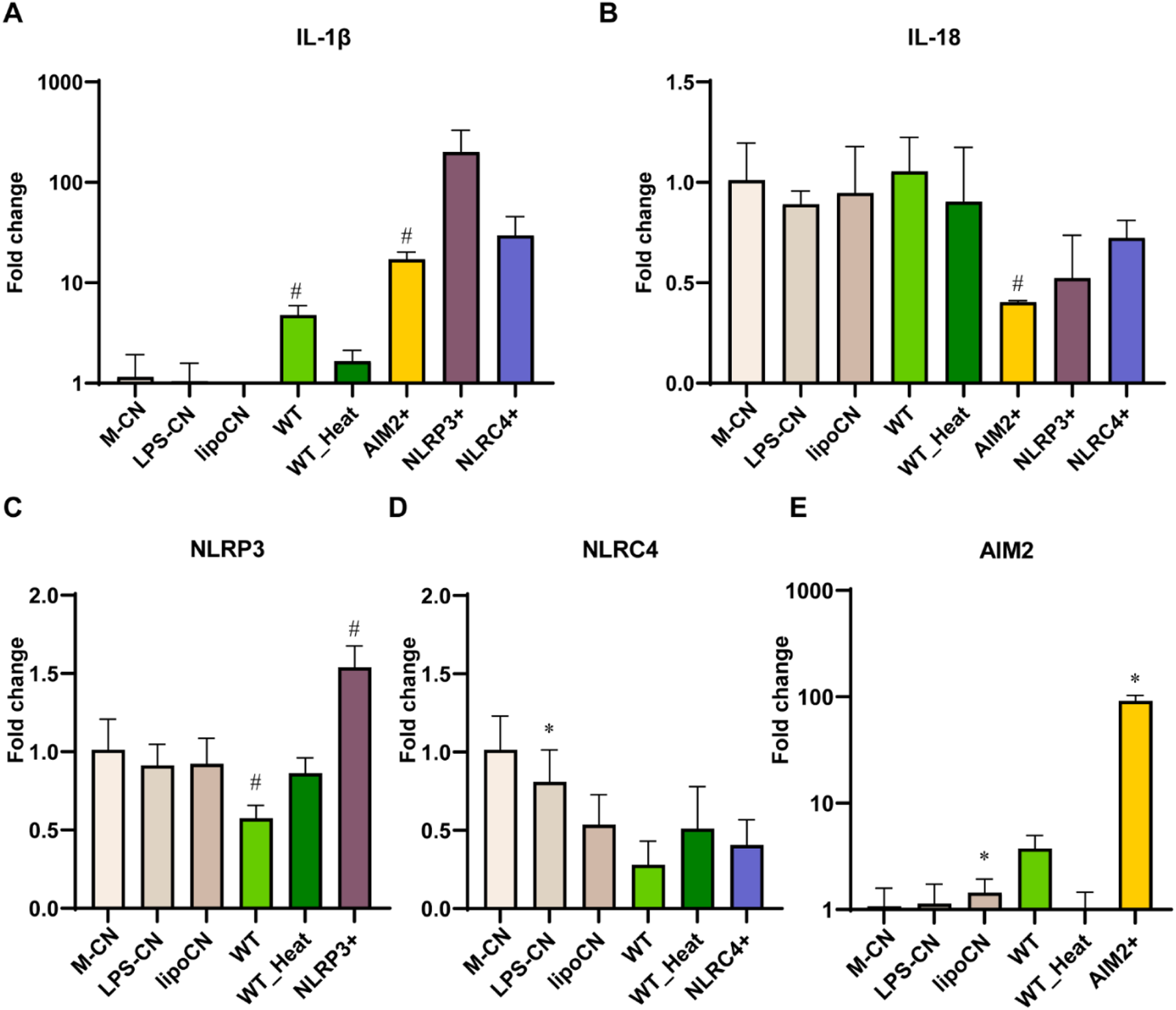 THP-1 macrophages gene expression of inflammasomes (A) IL-1β, (B) IL-18, (C) NLRP3, (D) NLRC4, (E) AIM2. IL-1β and IL-18 after 10 μM rFIP-nha (WT), heated WT (WT_Heat), and inflammasomes positive control treatment for 6 h. The LPS content of rFIP-nha was added as LPS-CN; Lipofectamine™ 2000 was added as lipoCN; 1 μg/mL LPS with 5 mM ATP was considered as NLRP3 positive control (NLRP3+); 1 μg/mL Ultrapure flagellin from S. typhimurium was transferred to THP-1 macrophages via Lipofectamine™ 2000 as NLRC4 positive control (NLRC4+); 2 μg/mL poly (dA:dT) was transferred to THP-1 macrophages via Lipofectamine™ 2000 as AIM2 positive control (AIM2+); Non-treated cells were exposed to medium (M-CN); WT was heated at 100°C for 10 min and diluted in the medium as WT_Heat. All values were compared to M-CN, with #p < 0.1, *p < 0.05.