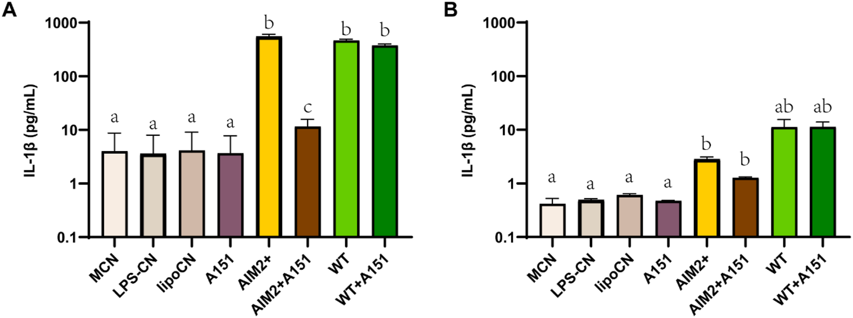 IL-1β cytokine secretion of THP-1 macrophages (A) and THP1-KO-ASC macrophages (B) treated with AIM2 positive control, rFIP-nha WT and inhibitor A151 (n = 3). The LPS content of rFIP-nha was added as LPS-CN; Lipofectamine™ 2000 was added as lipoCN; 2 μg/mL poly (dA:dT) was transferred macrophages via Lipofectamine™ 2000 as AIM2 positive control (AIM2+); cells exposed to medium we included as non-treated control (M-CN). Macrophages were treated with samples for 16 h. Group “a,” group “b” and group “c” are with significant difference (p < 0.05), group “ab” shows no significant difference between group “a” and “b.”