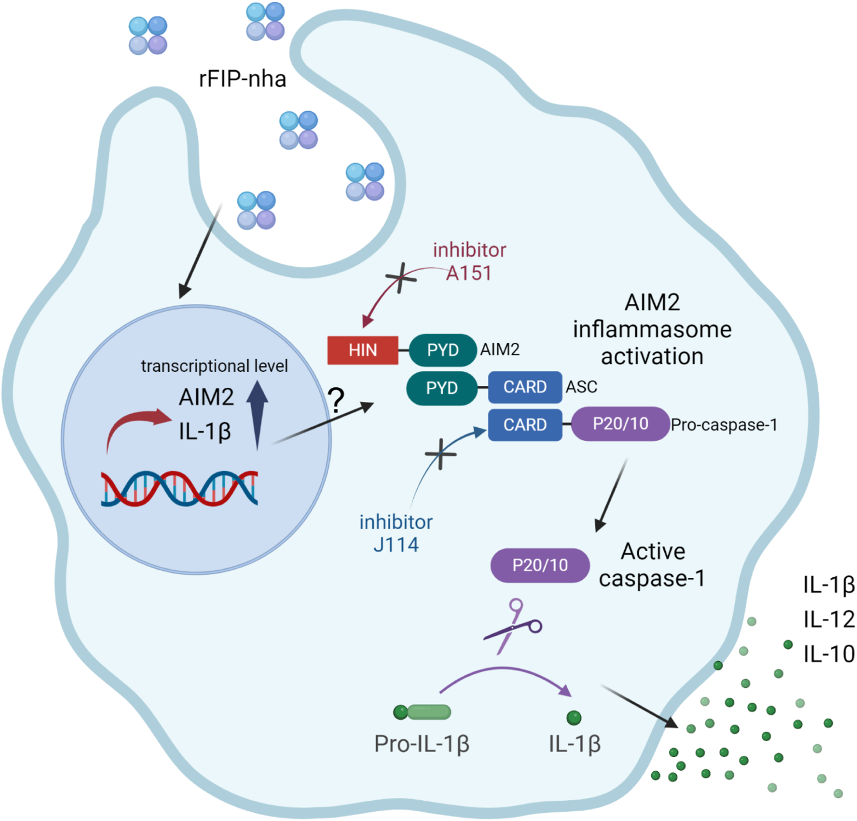 IL-1β is a pro-inflammatory cytokine and its maturation depends on the activation of caspase-1, while caspase-1 activation is triggered by inflammasome activation (Alehashemi and Goldbach-Mansky, 2020). Inflammasomes are activated in response to various stimuli (Pandey et al., 2021; Li Y. et al., 2021). Upon stimulation, a cytosolic multiprotein complex forms, consisting of the innate immune receptor protein, adapter protein ASC, and the inflammatory protease caspase-1. Inflammasomes can be categorized into different types based on their composition, including NLRP1, NLRP3, NLRC4, AIM2, and others (Pandey et al., 2021). We found that rFIP-nha activated macrophages through the AIM2 inflammasome (Figures 4–6). Most likely rFIP-nha is taken up by macrophages (Figure 1), after which rFIP-nha upregulates IL-1β and AIM2 inflammasome gene expression (Figure 4), activating a caspase activity cascade that leads to the induction of IL-1β, IL-12 and IL-10 secretion (Figure 3). AIM2 upregulation by rFIP-nha was in line with observations for Mycobacterium bovis, the causative agent of bovine tuberculosis, which triggered interleukin 1β (IL-1β) in J774A.1 macrophages via the AIM2 inflammasome (Yang, 2013). Upregulation of relative AIM2 gene expression was most pronounced at 24 h postinfection and approximately 6-fold compared to non-infected macrophages. In addition, a similar (approx. 4-fold) upregulation of AIM2 in M2-polarised THP-1 macrophages was seen for the plant Withania somnifera derived lactone triterpenoid Withaferin A (Ngoungoure and Owona, 2019).
