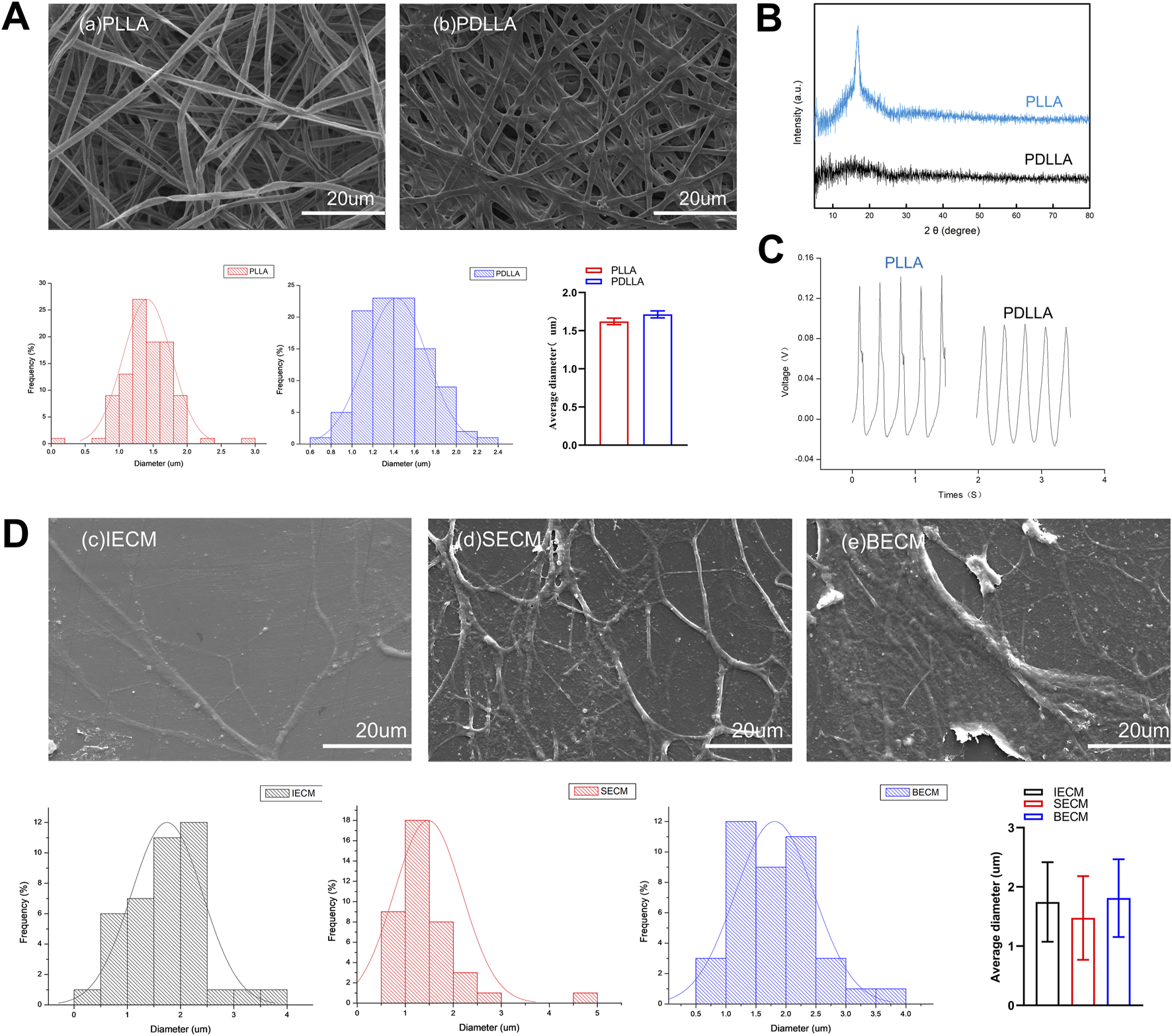 Electrospun nanofiber PLLA and PDLLA scaffolds and dECM morphology were observed under SEM. Nanofiber scaffolds exhibited a 3D structure with nondirectional arrangements. PLLA and PDLLA nanofiber scaffold diameters were 1.41 ± 0.35 µm and 1.42 ± 0.29 µm, respectively. No significant diameter differences were detected between groups (Figure 2A). Additionally, XRD analysis identified a characteristic peak at 17.1° in the β-phase of piezoelectric PLLA, which was absent in PDLLA (Figure 2B). Piezoelectric testing revealed that both PLLA and PDLLA exhibited piezoelectricity, though the extremely low voltage in PDLLA may result from triboelectric effects (Figure 2C).