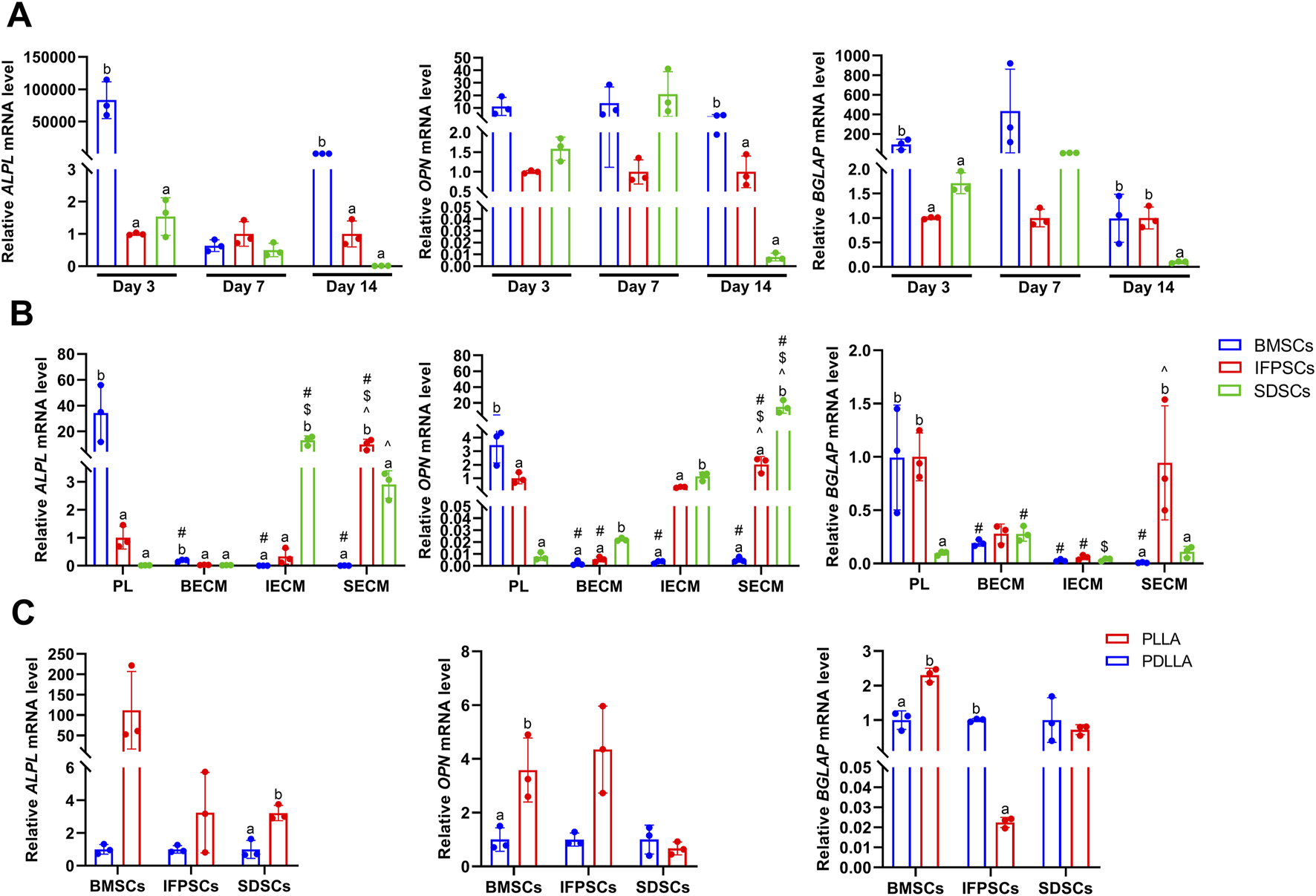 Figure 5. (A) Gene expression associated with osteogenesis at 3, 7, and 14 days in cells grown in Plastic. (B) Gene expression at 14 days of osteogenesis in IFPSCs, SDSCs, and BMSCs pretreated with dECMs, compared to Plastic (PL). (C) Gene expression in IFPSCs, SDSCs, and BMSCs on nanofiber PLLA scaffolds after 7 days of osteogenesis, compared to PDLLA.