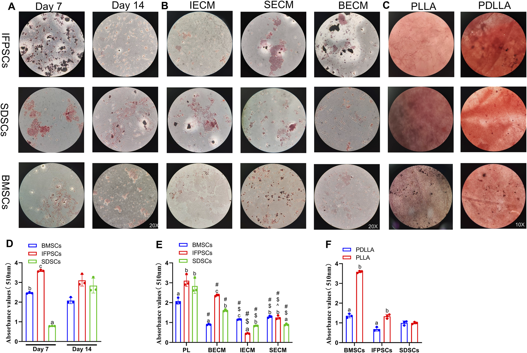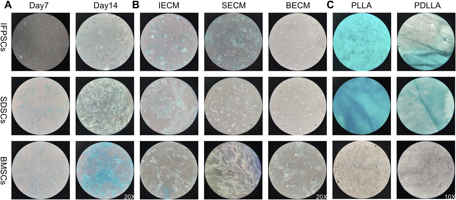 After 7 days of chondrogenic induction on PLLA and PDLLA scaffolds, IFPSCs and SDSCs exhibited stronger Ab staining than BMSCs on both. Notably, while no significant differences in BMSC staining intensity were identified between PLLA and PDLLA, IFPSCs and SDSCs showed slightly stronger staining on PLLA than on PDLLA under microscope (Figure 8C). It is interesting to note that BMSCs and IFPSCs on PLLA exhibited higher expression of SOX9, COL2A1, and ACAN compared to those on PDLLA. However, SDSCs demonstrated a lower ability to differentiate into chondrocytes on PLLA than on PDLLA (Figure 9C). These findings indicate that BMSCs and IFPSCs are more compatible with PLLA for cartilage regeneration, while SDSCs show better suitability for PDLLA, likely due to differential cellular responses to the materials.