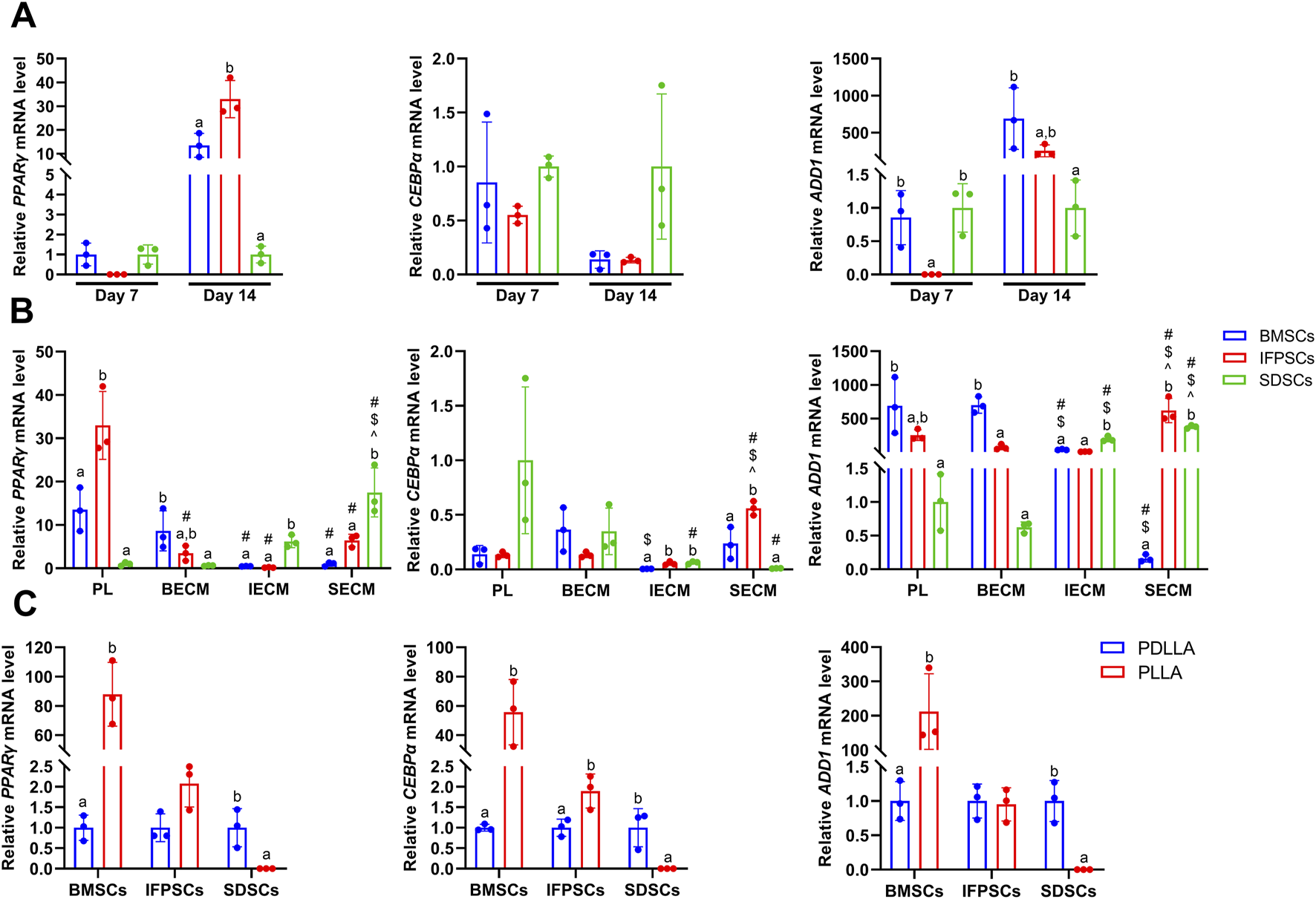 Figure 7. (A) Gene expression associated with adipogenesis at day 7 and 14 in cells grown in Plastic (PL). (B) Gene expression at day 14 of adipogenesis in IFPSCs, SDSCs, and BMSCs pretreated with dECM, compared to PL group. (C) Gene expression in IFPSCs, SDSCs, and BMSCs on nanofiber PLLA scaffold after 7 days of adipogenesis, compared to PDLLA.
