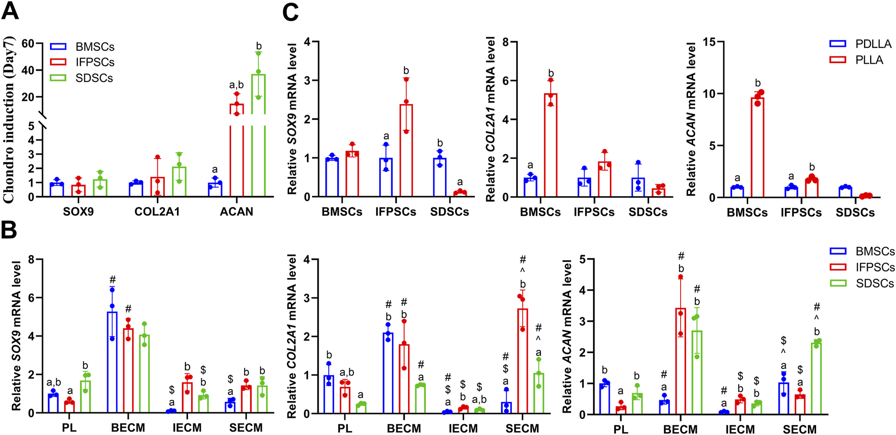 Figure 9. (A) Gene expression associated with chondrogenesis at days 7 in cells grown in Plastic (PL). (B) Gene expression at day 14 of chondrogenesis in IFPSCs, SDSCs, and BMSCs pretreated with dECM, compared to PL group. (C) Gene expression in IFPSCs, SDSCs, and BMSCs on nanofiber PLLA scaffold after 7 days of chondrogenesis, compared to PDLLA.