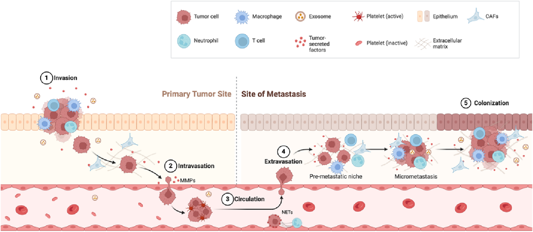 Metastasis steps. Invasion: Tumor cells break through surrounding tissue with help from immune cells such as macrophages and neutrophils. Intravasation: Tumor cells enter the bloodstream by breaking down the tissue barrier using matrix metalloproteinases (MMPs). Circulation: Tumor cells travel through the blood, protected by platelets and other factors. Extravasation: Tumor cells exit the bloodstream and settle in a new site (pre-metastatic niche). Colonization: Tumor cells grow into new tumors at the metastatic site.