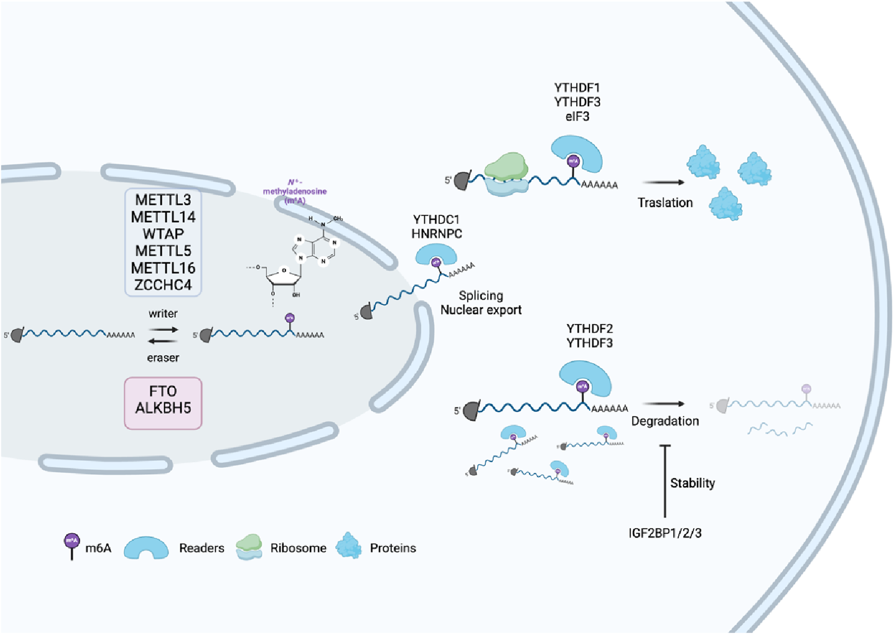 Process of m6A modification and its molecular functions. m6A modification of mRNA is added by “writers” (e.g., METTL3 and METTL14) and removed by “erasers” (FTO and ALKBH5), influencing mRNA fate. m6A-binding “readers,” such as YTHDC1, regulate splicing and export to the nucleus, whereas YTHDF1/3 promote translation in the cytoplasm. Other readers, such as YTHDF2, trigger mRNA degradation, and IGF2BP proteins stabilize mRNA.