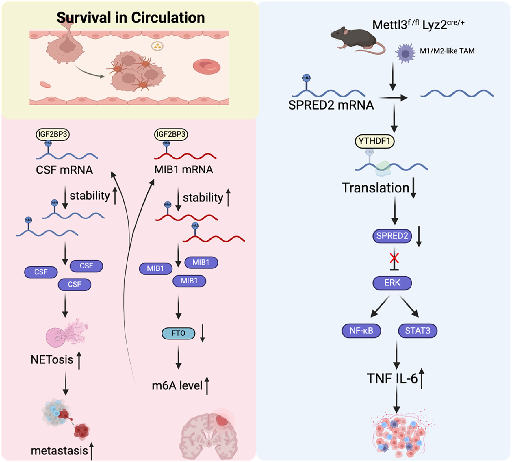 Neutrophil extracellular traps (NETs) are web-like structures composed of histones, DNA, and cytotoxic proteins originating from granules. Tumor cell-induced NETs can promote the survival and metastasis of tumor cells (Adrover et al., 2023). A study found that IGF2BP3 induced NET formation in malignant gliomas and significantly enhanced glioma cell survival (Dai et al., 2024). In liver cancer, METTL5 was found to promote the generation and release of NETs, which may further accelerate the progression of hepatocellular carcinoma. However, the precise mechanism requires further clarification (Wang et al., 2024). Tumor-associated macrophages (TAMs) can also promote the dissemination and extravasation of CTCs (Doak et al., 2018). TAMs actively communicate with CTCs, promoting their survival and aiding in their mesenchymal transformation. They secrete specific cytokines and growth factors, such as TGF-β and interleukin-6, which enhance the EMT process in CTCs. This crosstalk is essential for the mesenchymal CTCs to maintain their invasive potential, allowing them to metastasize to distant organs, such as the liver and lungs (Wei et al., 2019). Moreover, TAMs facilitate the acquisition of enhanced mechanical adhesion properties and increased cellular resilience in CTCs, thereby promoting the formation of protective cell clusters. These clusters provide a survival advantage by conferring resistance to shear stress experienced during circulation in the bloodstream, ultimately supporting their metastatic potential (Osmulski et al., 2021). This study found that TAM can promote lung metastasis of melanoma by downregulating METTL3. Mechanistic studies have demonstrated that the loss of METTL3 results in decreased sprouty related EVH1 domain containing 2 (SPRED2) translation, mediated by YTHDF1. This reduction promotes the activation of nuclear factor kappa-light-chain-enhancer of activated B cells (NF-κB) and signal transducer and activator of transcription 3 (STAT3) signaling pathways, ultimately promoting enhanced tumor growth and metastasis (Yin et al., 2021).