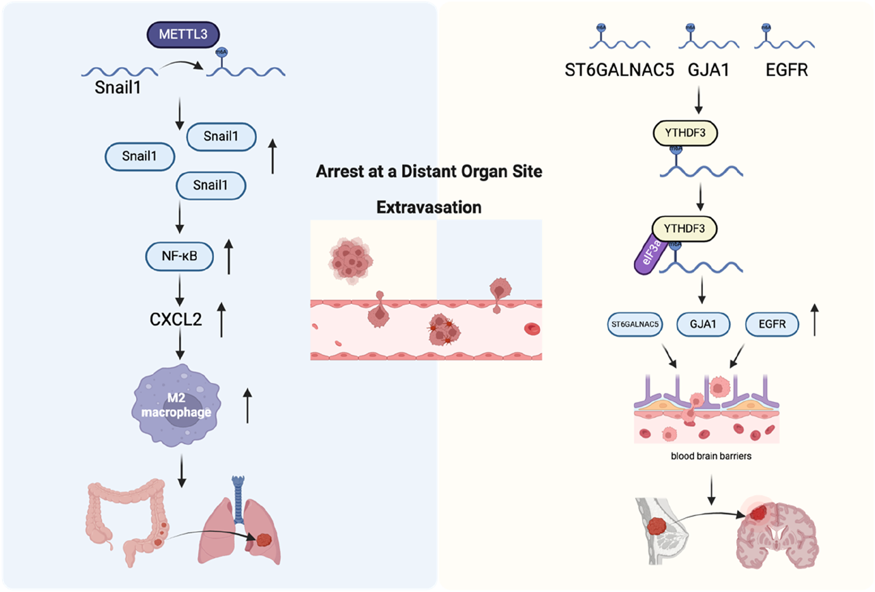 The role of m6A regulators in arrest at a distant organ site and extravasation. Left: Mechanism of colorectal cancer cell metastasis to the lungs. Right: Mechanism of breast cancer cell penetration through the blood-brain barrier and colonization in the brain.