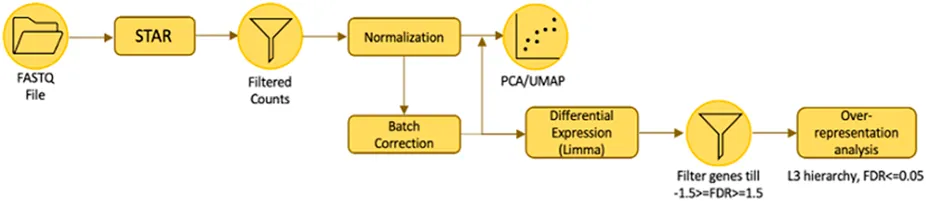 The workflow of RNA Sequencing Analysis is illustrated above. The analysis was conducted by our collaborators (Corinna Goh and Keng-Hwee Chiam) from A*STAR Bioinformatics Institute. The quality of the raw RNA-seq data was evaluated with FastQC (http://www.bioinformatics.babraham.ac.uk/projects/fastqc/). Genome indexes were generated using STAR version 2.7.9a with the comprehensive Gencode v39 gene annotation (Dobin et al., 2013). Raw paired-end FASTQ reads were aligned to the human reference genome GRCh38 and then quantified using STAR aligner (Dobin et al., 2013). They carried out low-counts filtering, count normalisation using the trimmed mean of M-values (TMM) method and Log2-transformed the counts per million (CPM) values in edgeR version 3.40.2 (Robinson et al., 2020). Since UMAP projections of the principal components (PCA-UMAP) indicated mild batch effects, batch correction was performed using removeBatchEffect function in limma version 3.54.2 on the Log-CPM values, where the batch variable was specified as the biological replicate (Ritchie et al., 2015).