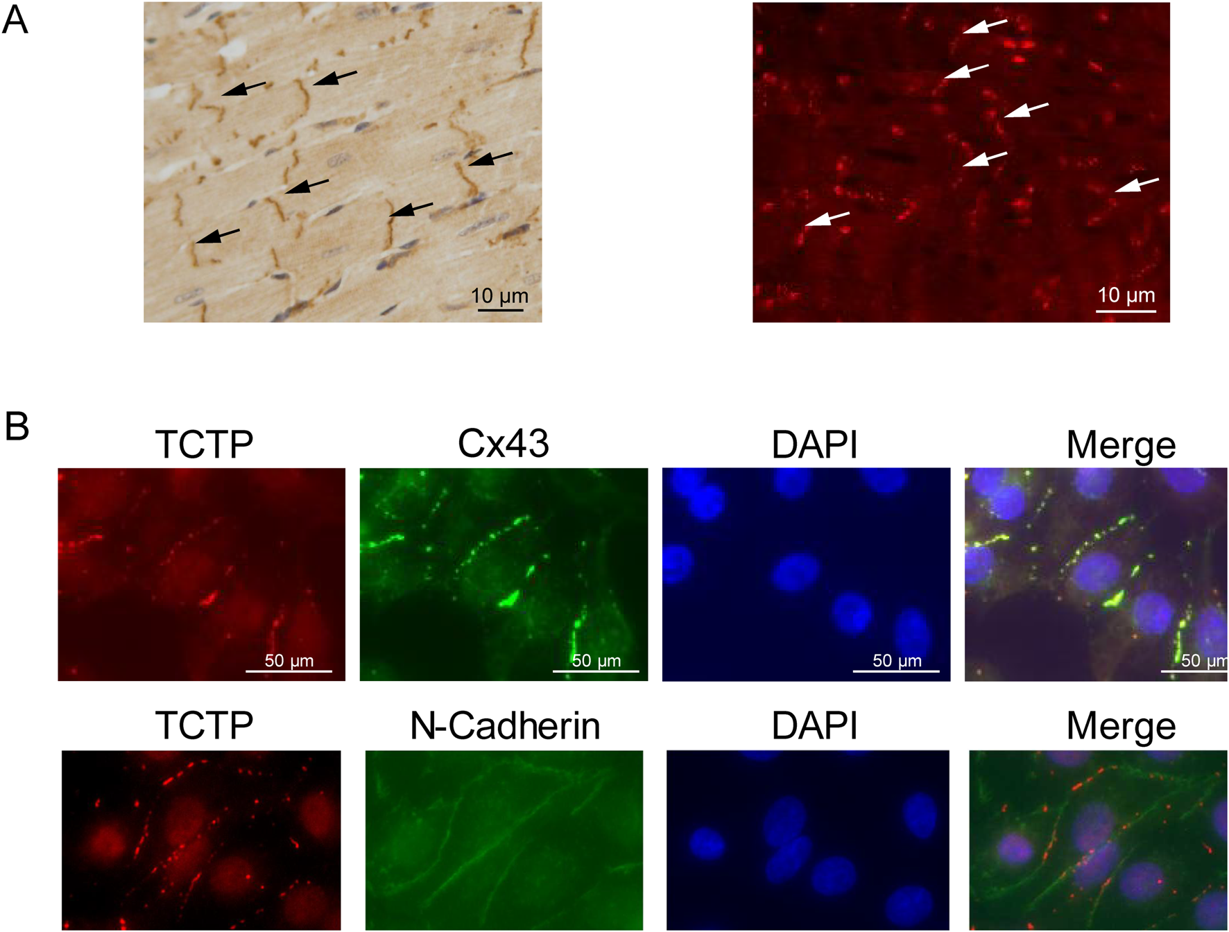 The present study revealed the following: TCTP is predominantly expressed in the intercalated discs of mouse heart tissue; TCTP is located close to Cx43 in cardiomyocytes; TCTP silencing reduced the formation of Cx43 gap junction channels at the intercellular contacts between cardiomyocytes; TCTP silencing significantly attenuates GJIC in cardiomyocytes; and in cardiomyocytes-specific TCTP overexpressing mouse, the development of catecholamine-induced ventricular arrhythmia was attenuated.