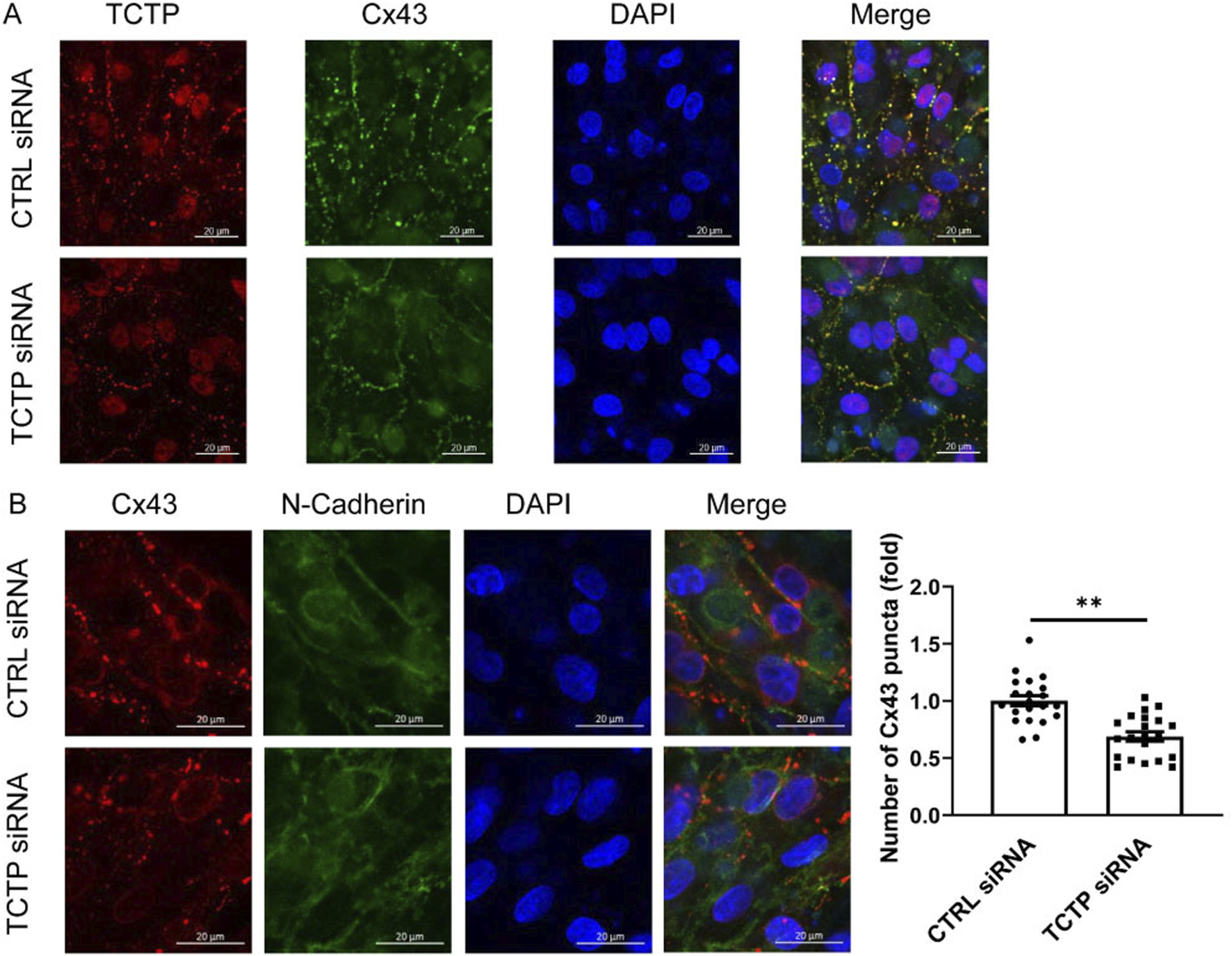 To examine the role of TCTP in the regulation of Cx43 expression, we downregulated TCTP expression using siRNA in NRVMs (Figure 4A). The effect of TCTP siRNA knockdown, which reduced the protein level by more than fivefold, was validated by Western blot analysis (Supplementary Figure S1). Using immunohistochemical staining, we investigated the effect of TCTP downregulation on the number of gap junction plaques expressed at intercellular contacts. Cx43-positive puncta were significantly decreased following TCTP silencing (Figure 4B). These findings indicated that TCTP downregulation decreased Cx43 expression in gap junction plaques between cardiomyocytes.