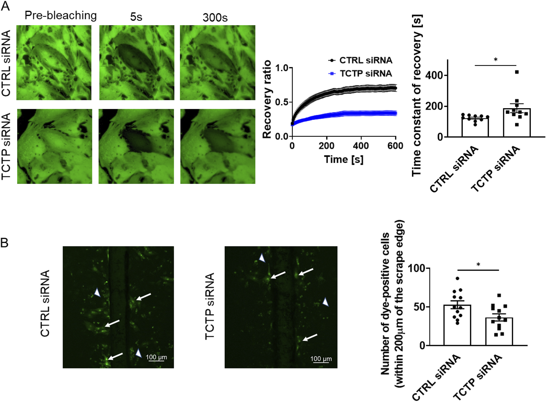 Next, to examine the role of TCTP in the regulation of Cx43 function at gap junctions, we evaluated the GJIC between cardiomyocytes using the FRAP assay. The development of GJIC and adherens junctions between adjacent cells has been previously reported in cultured cardiomyocytes (Somekawa et al., 2005; Kizana et al., 2007). The recovery from photobleaching was attenuated by TCTP downregulation with siRNA in NRVMs (Figure 5A). Additionally, scrape-loading dye transfer was decreased by TCTP silencing (Figure 5B), indicating that TCTP expression plays an important role in GJIC maintenance.
