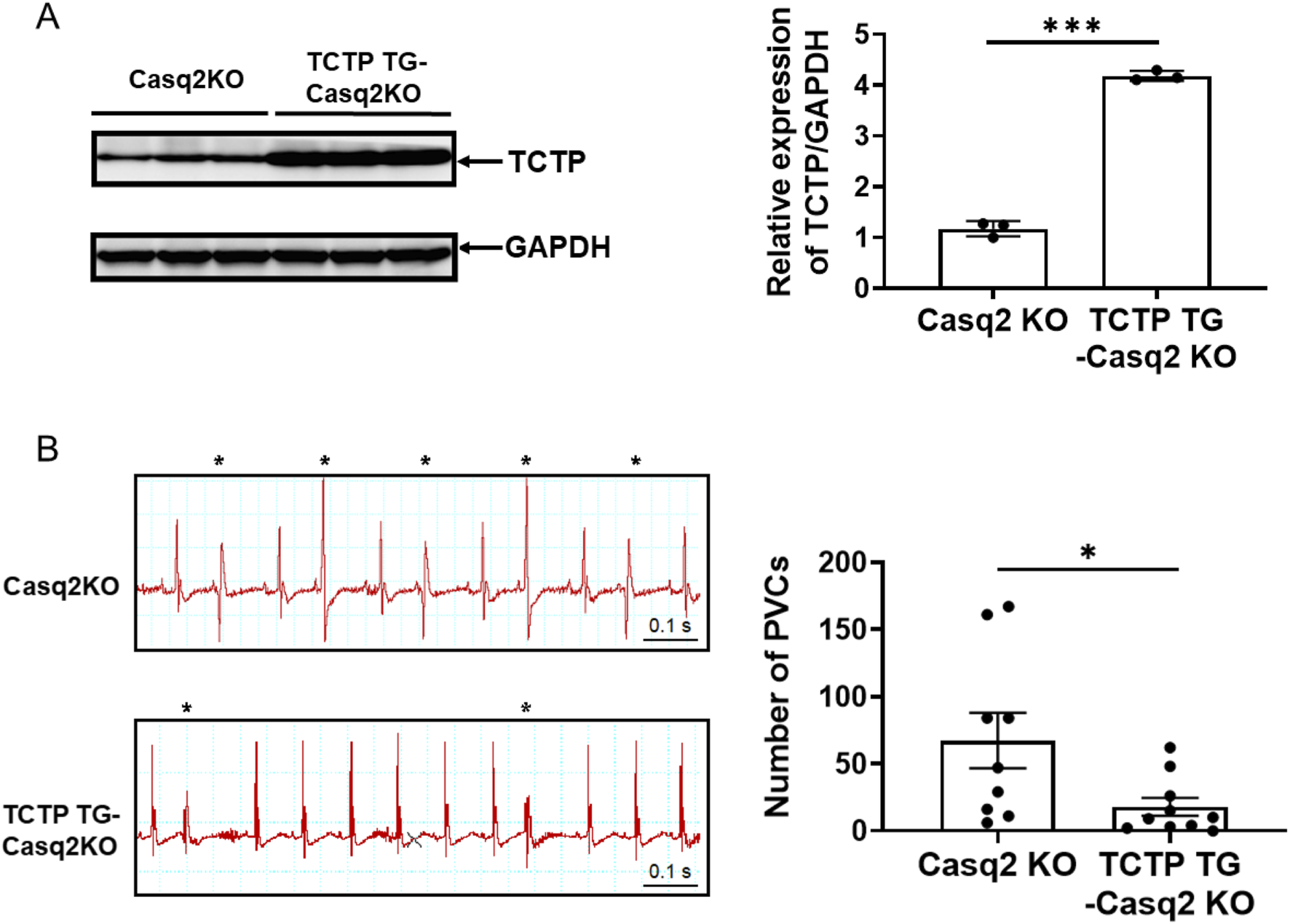 To investigate the role of TCTP expression in the development of arrhythmias, we generated cardiomyocyte-specific TCTP-overexpressing mice with a Casq2 KO background (TCTPTG-Casq2 KO), a mouse model of ventricular arrhythmias. In TCTPTG-Casq2 KO mice, TCTP expression levels in ventricular tissue were elevated (Figure 6A). Remarkably, sympathetic activation-induced development of PVCs was attenuated in TCTPTG-Casq2 KO mice compared to Casq2 KO mice (Figure 6B).