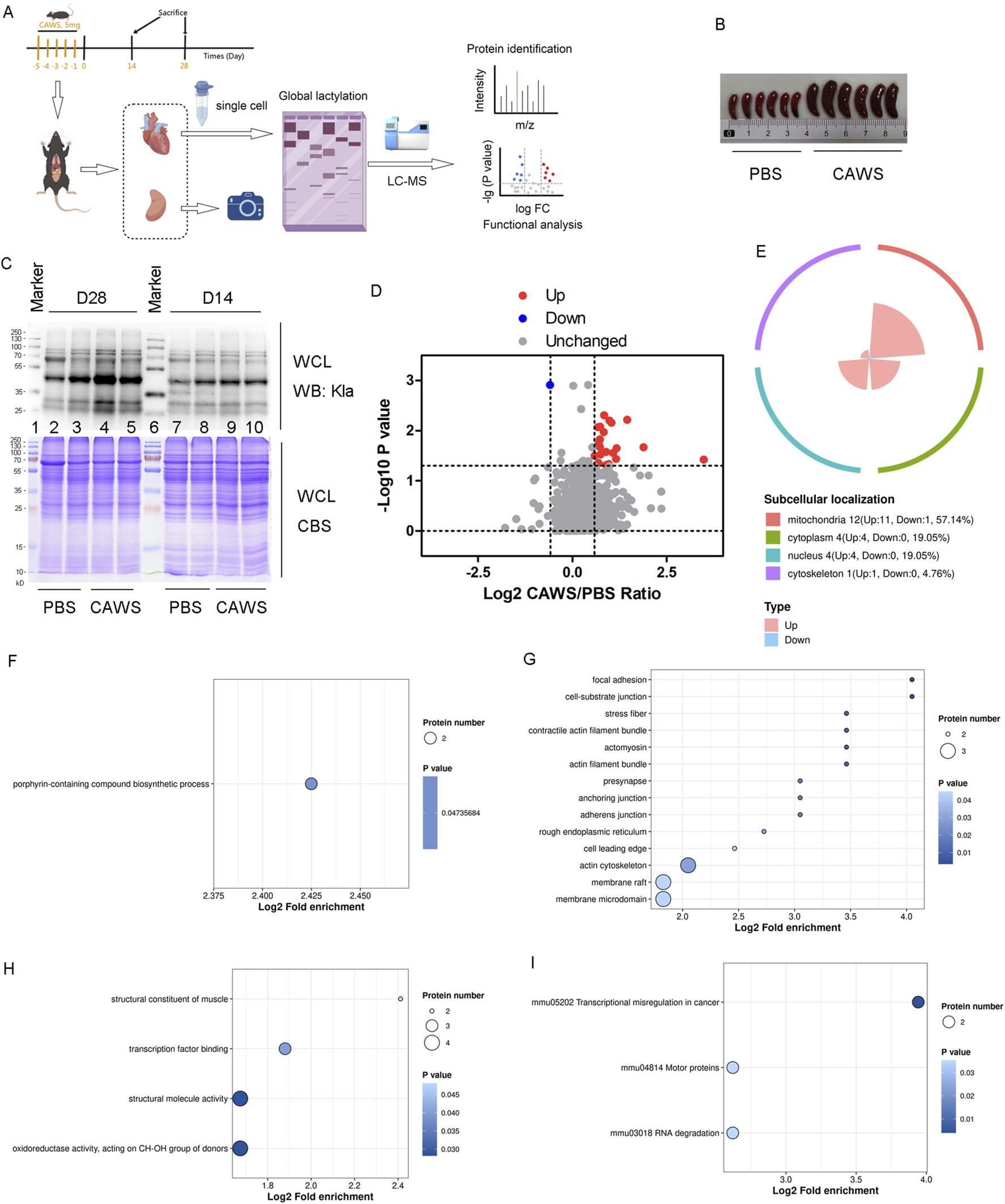 Kla modification in mouse hearts. (A) Schematic diagram of the mouse model experiments. (B) Spleens of mice treated with PBS or CAWS. (C) Kla modification levels in the hearts of PBS- and CAWS-treated mice on days 14 and 28. (D) Volcano plot of the altered Kla modification proteins. The FC value is greater than 1.5, and the p-value is less than 0.05. (E) Subcellular localization of altered Kla modification proteins. GO analysis encompassing (F) BPs, (G) CCs, and (H) MFs. (I) KEGG enrichment analysis of the Kla results. WCL, whole-cell lysate; CBT, Coomassie blue staining.