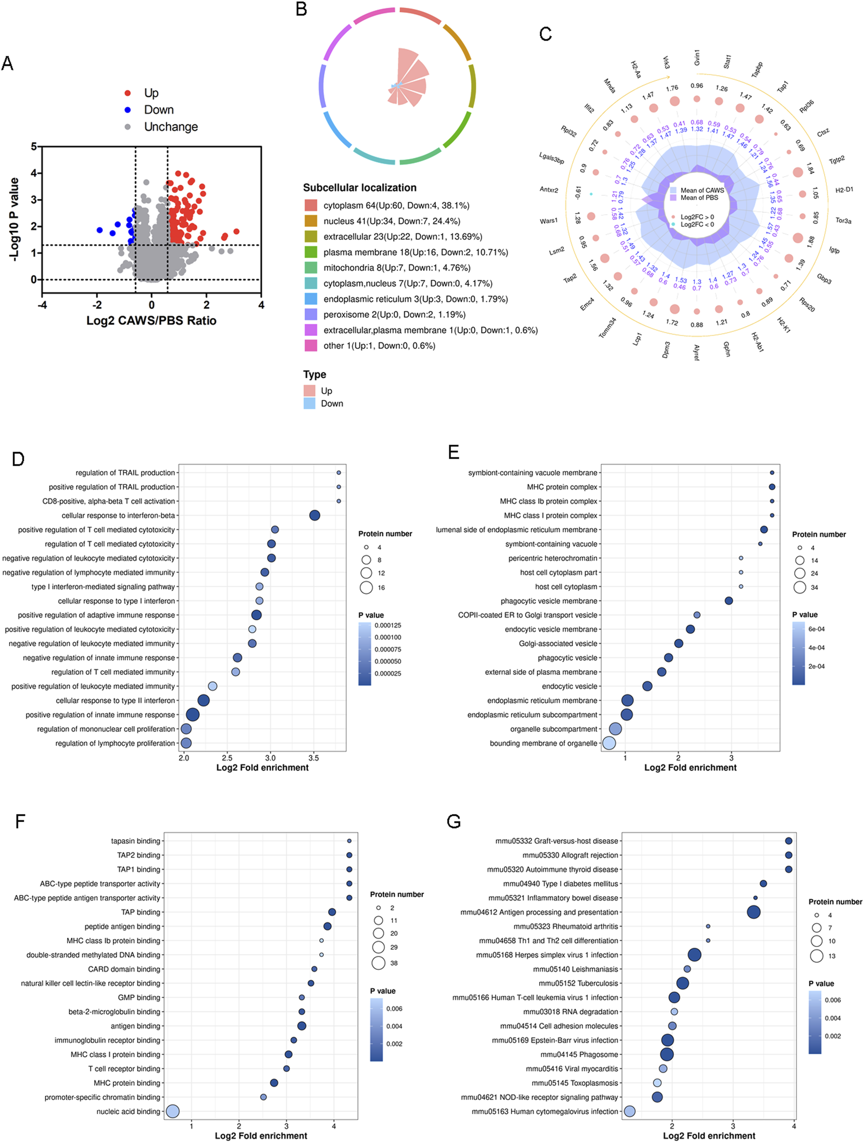 Proteomic analysis of the mouse hearts. (A) Volcano plot of the altered expression proteins. The FC value is greater than 1.5, and the p-value is less than 0.05. (B) Subcellular localization of the altered proteins. (C) Top 30 altered proteins. GO analysis encompassing (D) BPs, (E) CCs, and (F) MFs. (G) KEGG enrichment analysis of the proteomic results.