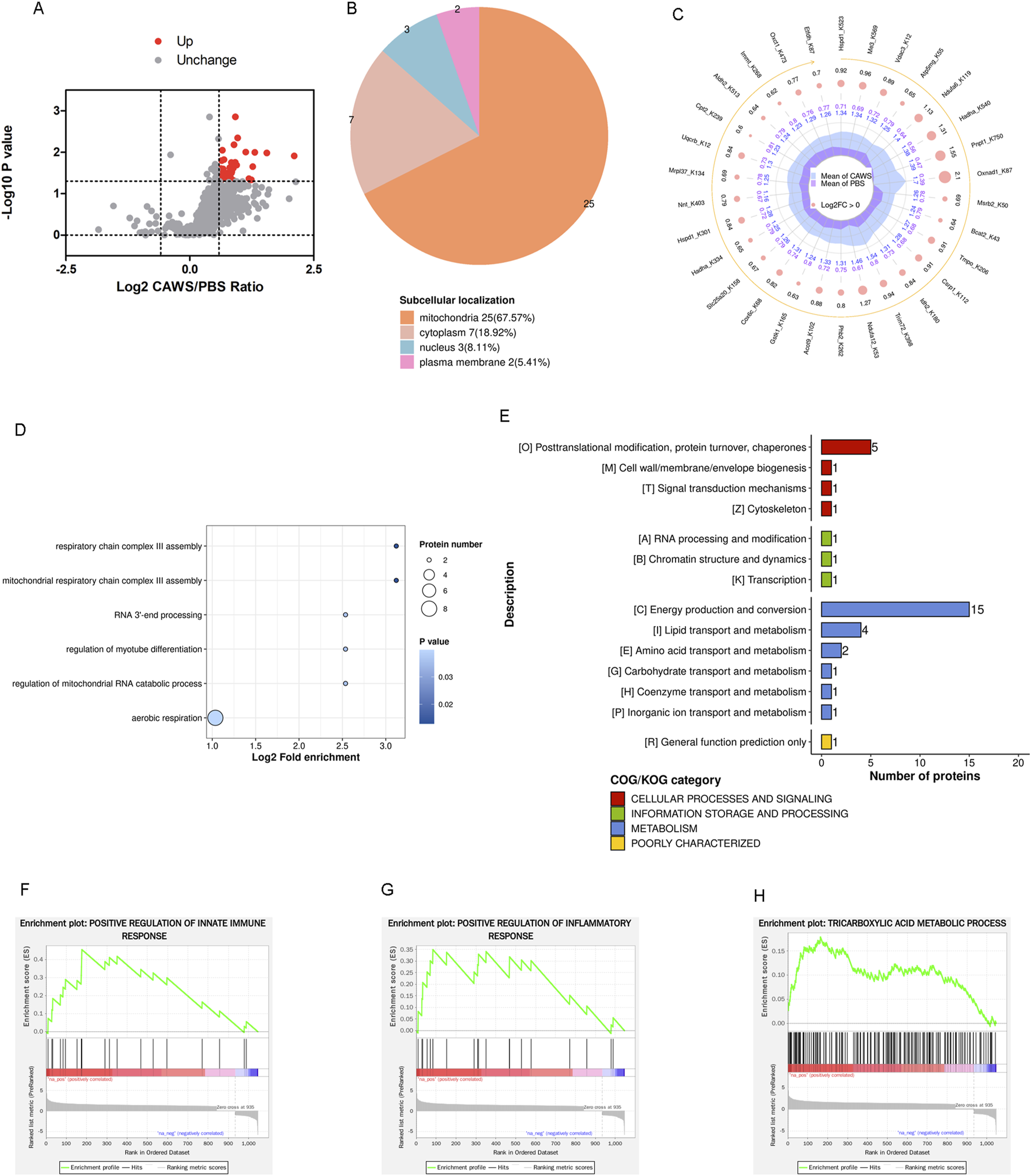 Normalized Kla modification in mouse hearts. (A) Volcano plot of the normalized altered Kla-modified proteins. The FC value is greater than 1.5, and the p-value is less than 0.05. (B) Subcellular localization of the normalized altered Kla-modified proteins. (C) Top 30 altered Kla-modified proteins. (D) BP term of GO analysis. (E) COG classification of Kla-modified proteins. The GSEA indicated the pathways of (F) positive regulation of innate immune responses, (G) positive regulation of inflammatory responses, and (H) tricarboxylic acid metabolic processes were affected.
