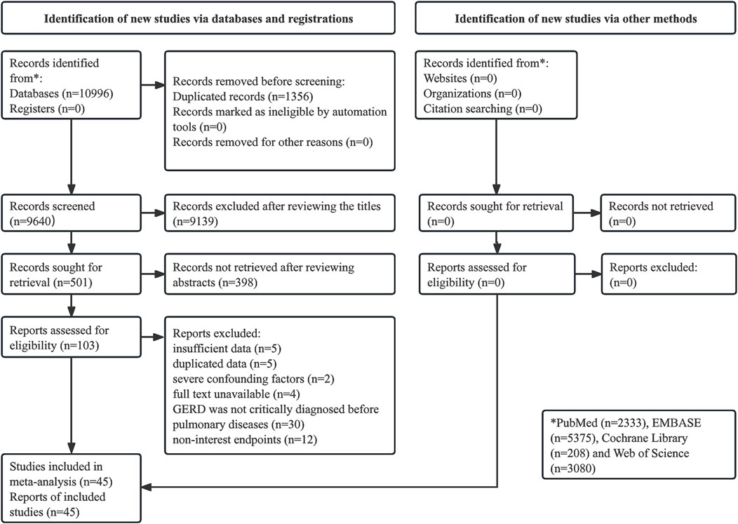 The literature search and selection process were presented in Figure 1. Initially, 10,996 records were identified from the databases, and 1,356 duplicated records were removed. A total of 9,139 and 398 publications were excluded after reviewing the titles and abstracts, respectively. After the full texts were carefully reviewed, 57 publications were excluded, thirty of which were due to GERD not being critically diagnosed before the occurrence of pulmonary disease. Eventually, 45 studies were included in the meta-analysis (el-Serag and Sonnenberg, 1997; El-Serag et al., 2001; Gislason et al., 2002; Jaspersen et al., 2003; Gunnbjömsdóttir et al., 2004; Ruigómez et al., 2005; Garcia Rodriguez et al., 2008; Gribbin et al., 2009; Uddenfeldt et al., 2010; García-Sancho et al., 2011; Emilsson et al., 2013; Patria et al., 2013; Martinez et al., 2014; Wang et al., 2014; Zhong et al., 2015; Fan et al., 2016; Hsu et al., 2016; Yang et al., 2016; Hsu et al., 2017; Zhang et al., 2017; Choi et al., 2019; Kim et al., 2020a; Kim et al., 2020b; Kuo et al., 2020; Wang et al., 2020; Abdel Baseer and Sakhr, 2021; Baqir et al., 2021; Cantarutti et al., 2021; Amarnath et al., 2022; Ahn et al., 2023; Cotton et al., 2023; Duncan et al., 2023; Jareebi et al., 2023; Kim et al., 2023; Li et al., 2023b; Reynolds et al., 2023; Sarwar Zubairi et al., 2023; Shen et al., 2023; Cleven et al., 2024; Dong et al., 2024; Fakhraei et al., 2024; Liu et al., 2024; Shan and Ge, 2024.