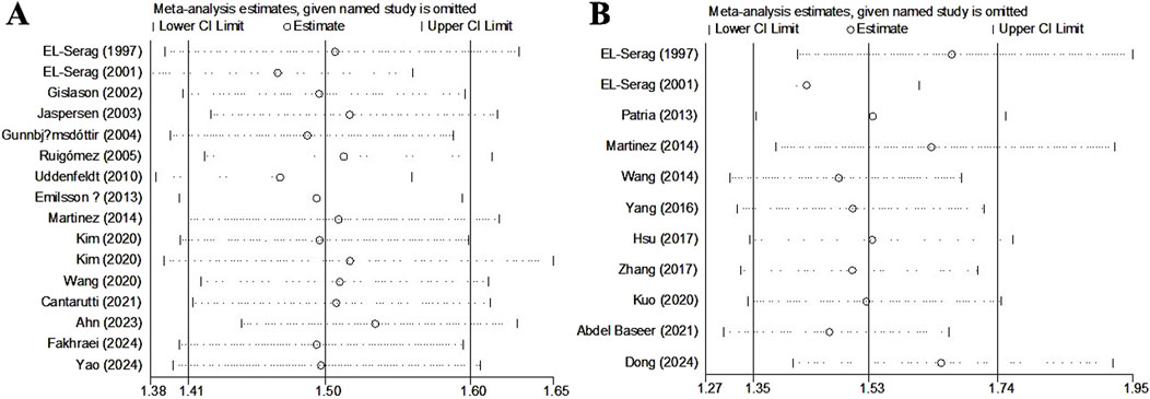 Figure 4. Sensitivity analysis about the association of gastroesophageal reflux disease with the incidence of asthma (A) and pneumonia (B).