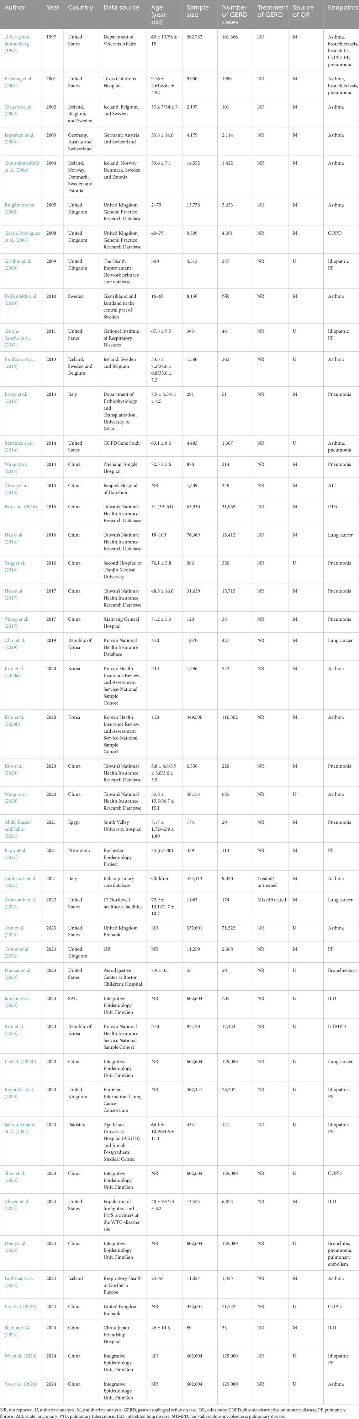 These 45 cohort studies were published from 1997-2024, with sample sizes ranging from 43-602,604. Most of the participants were from public databases and were adult patients. The associations of GERD with the incidence of asthma (el-Serag and Sonnenberg, 1997; El-Serag et al., 2001; Gislason et al., 2002; Jaspersen et al., 2003; Gunnbjömsdóttir et al., 2004; Ruigómez et al., 2005; Uddenfeldt et al., 2010; Emilsson et al., 2013; Martinez et al., 2014; Kim et al., 2020a; Kim et al., 2020b; Wang et al., 2020; Cantarutti et al., 2021; Ahn et al., 2023; Fakhraei et al., 2024; Yao et al., 2024), pneumonia (el-Serag and Sonnenberg, 1997; El-Serag et al., 2001; Patria et al., 2013; Martinez et al., 2014; Wang et al., 2014; Yang et al., 2016; Hsu et al., 2017; Zhang et al., 2017; Kuo et al., 2020; Abdel Baseer and Sakhr, 2021; Dong et al., 2024), PF (el-Serag and Sonnenberg, 1997; Gribbin et al., 2009; García-Sancho et al., 2011; Baqir et al., 2021; Cotton et al., 2023; Reynolds et al., 2023; Sarwar Zubairi et al., 2023; Wu et al., 2024), COPD (el-Serag and Sonnenberg, 1997; Garcia Rodriguez et al., 2008; Shen et al., 2023; Liu et al., 2024), lung cancer (Hsu et al., 2016; Choi et al., 2019; Amarnath et al., 2022; Li et al., 2023b), ILD (Jareebi et al., 2023; Cleven et al., 2024; Shan and Ge, 2024), bronchiectasis (el-Serag and Sonnenberg, 1997; El-Serag et al., 2001; Duncan et al., 2023) and bronchitis (el-Serag and Sonnenberg, 1997; Dong et al., 2024) were explored in 16, 11, 8, 4, 4, 3, 3 and 2 of the included studies, and 1 study explored the relationships between GERD and the incidence of ALI (Zhong et al., 2015), pulmonary embolism (Dong et al., 2024), PTB (Fan et al., 2016) and NTMPD (Kim et al., 2023). The data are shown in Table 1.