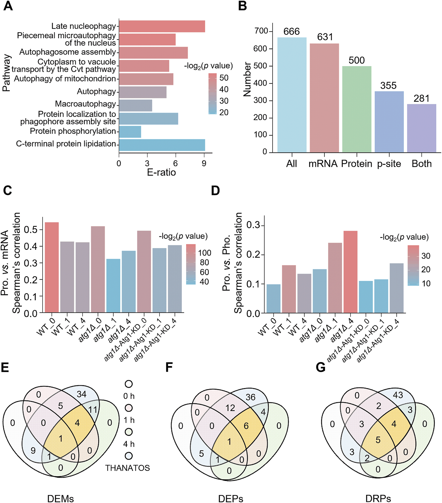 Here, we took the WT strain data as the background data and compared them with the transcriptomic, proteomic and phosphoproteomic data of atg1∆ strains or atg1∆-Atg1 KD yeasts to detect the differentially regulated mRNAs, proteins and p-sites at 0, 1 and 4 h. The mRNAs with significantly changed FPKM values (FC > 3 or FC < 1/3) for at least one time point were regarded as potential DEMs (p < 0.01). For proteomic data and phosphoproteomic data, the p values were calculated using the Model-based Analysis of Proteomic data (MAP) method (Li et al., 2019; Qiu et al., 2021). Unlike conventional statistical tests that rely on replicate-based variance estimates, MAP models technical and systematic errors without requiring biological replicates. The method is based on the hypothesis that proteins with similar intensity levels (within a small window) share approximately the same error characteristics. Specifically, proteins and p-sites are first ranked based on their intensities, and a local error function is constructed by analyzing the distribution of fold changes in neighboring proteins. These local functions are then integrated to generate a global error function that serves as the background noise model. Assuming a standard normal distribution of log-transformed fold changes under the null hypothesis, MAP calculates a z-score for each protein and p-site, from which a two-tailed p-value is derived. This strategy allows for robust identification of differentially expressed proteins or p-sites, even in datasets with limited or no biological replicates. The proteins and p-sites with significant fold change intensities (FC > 3 or FC < 1/3; p < 0.01) for at least one time point were also regarded as potential DEPs and DRPs.