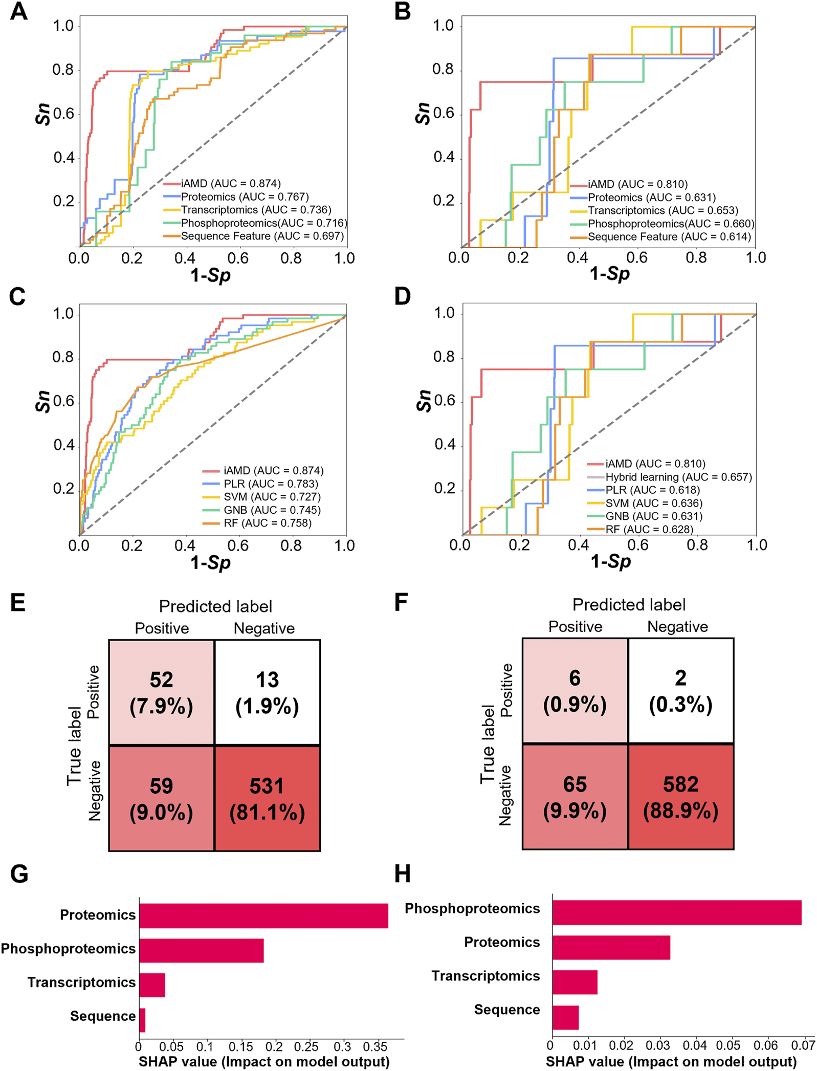 To exhibit the superiority of iAMD, which uses multi-omic data and sequence features, over DNN models that are individually trained by single features, we compared the iAMD framework with a proteome-trained DNN model, a transcriptome-trained DNN model, a phosphoproteome-trained DNN model, and a sequence feature-trained DNN model. Also, based on multi-omic data and sequence features, we compared iAMD to four conventional machine learning algorithms, including PLR, SVM, GNB, and RF. The above methods were also implemented in the open source Python library Scikit-learn 0.24.1 (https://scikit-learn.org/stable/index.html). For the Atg1 substrate model, the hybrid-learning model without the meta-learning strategy was also trained. The ROC curves of those models were illustrated, and the AUC values were calculated.