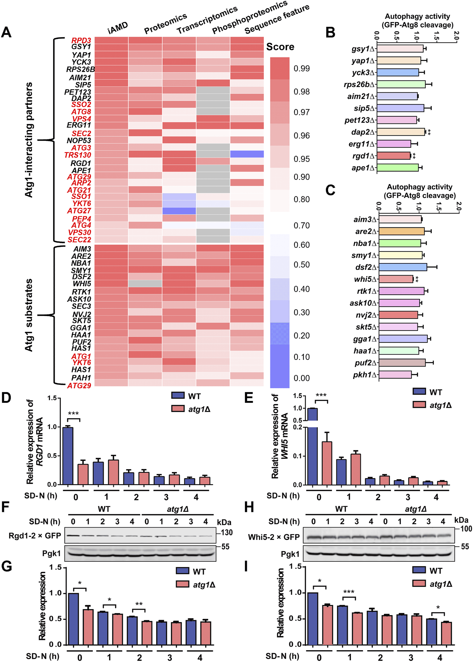 In Saccharomyces cerevisiae, Atg1 is a core autophagy-related (Atg) protein kinase (PK) in regulating macroautophagy/autophagy, by physically interacting with numerous other proteins, or by phosphorylating various substrates. It is unclear how many Atg1-interacting partners and substrates are also involved in regulating autophagy. Here, we conducted transcriptomic, proteomic and phosphoproteomic profiling of Atg1-dependent molecular landscapes during nitrogen starvation-triggered autophagy, and detected 244, 245 and 217 genes to be affected by ATG1 in the autophagic process at mRNA, protein, and phosphorylation levels, respectively. Based on the Atg1 interactome, we developed a novel artificial intelligence (AI) framework, inference of autophagy regulators from multi-omic data (iAMD), and predicted 12 Atg1-interacting partners and 17 substrates to be potentially functional in autophagy. Further experiments validated that Rgd1 and Whi5 are required for bulk autophagy, as well as physical interactions and co-localizations with Atg1 during autophagy. In particular, we demonstrated that 2 phosphorylation sites (p-sites), pS78 and pS149 of Whi5, are phosphorylated by Atg1 to regulate the formation of Atg1 puncta during autophagy initiation. A working model was illustrated to emphasize the importance of the Atg1-centered network in yeast autophagy. In addition, iAMD was extended to accurately predict Atg proteins and autophagy regulators from other PK interactomes, indicating a high transferability of the method. Taken together, we not only revealed new autophagy regulators from the Atg1 interactome, but also provided a useful resource for further analysis of yeast autophagy.
