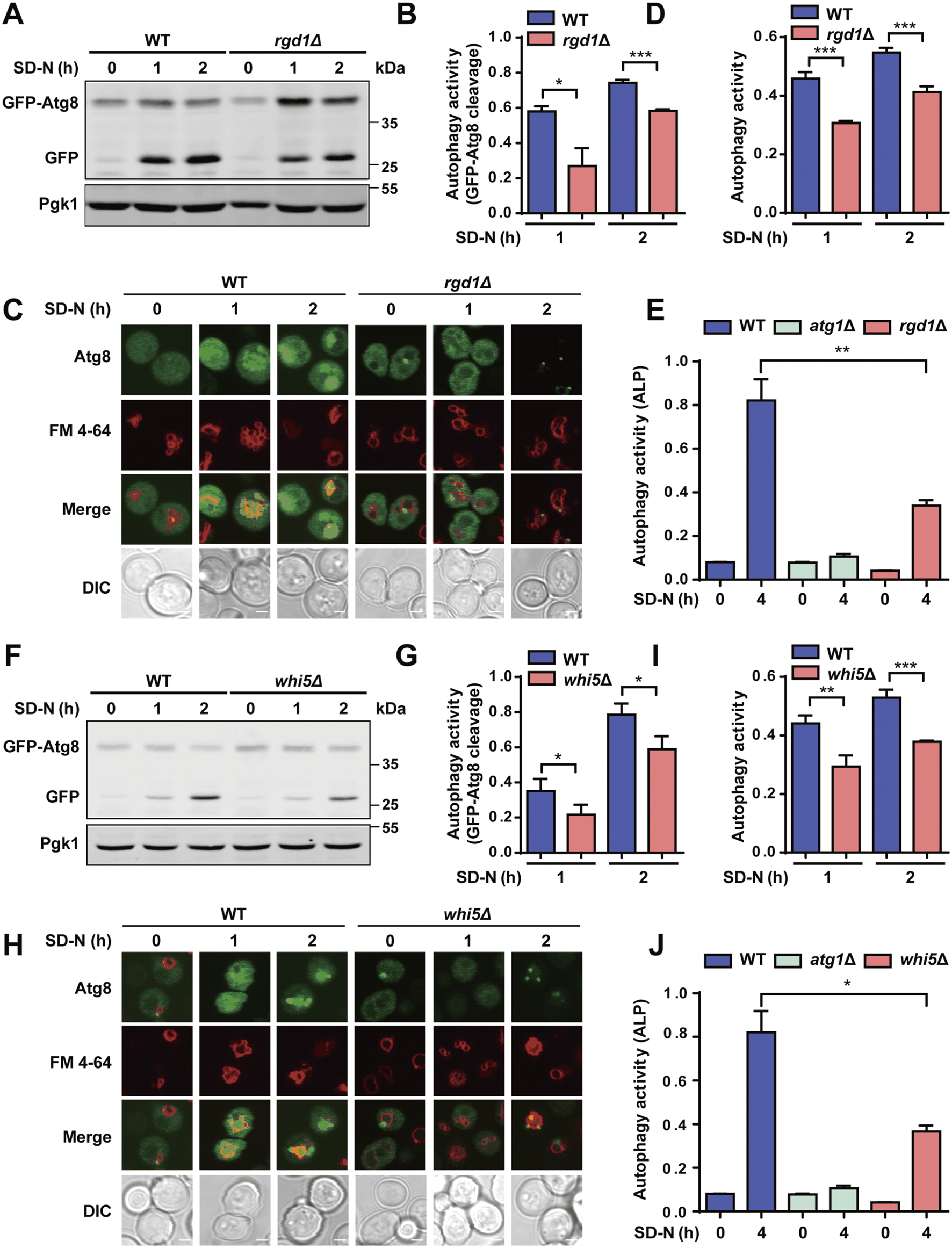 To quantitatively measure the autophagy activity of yeasts, our recently developed software, DeepPhagy (Zhang et al., 2019), was employed to automatically recognize the GFP signals derived from GFP-Atg8 in the vacuoles. Briefly, three pictures were independently captured for WT, rgd1∆ and whi5∆ cells expressing GFP-Atg8 at each time point. Next, the obtained images were imported and analyzed to evaluate autophagy activity, which was represented as the ratio of autophagic cells to all recognized cells.
