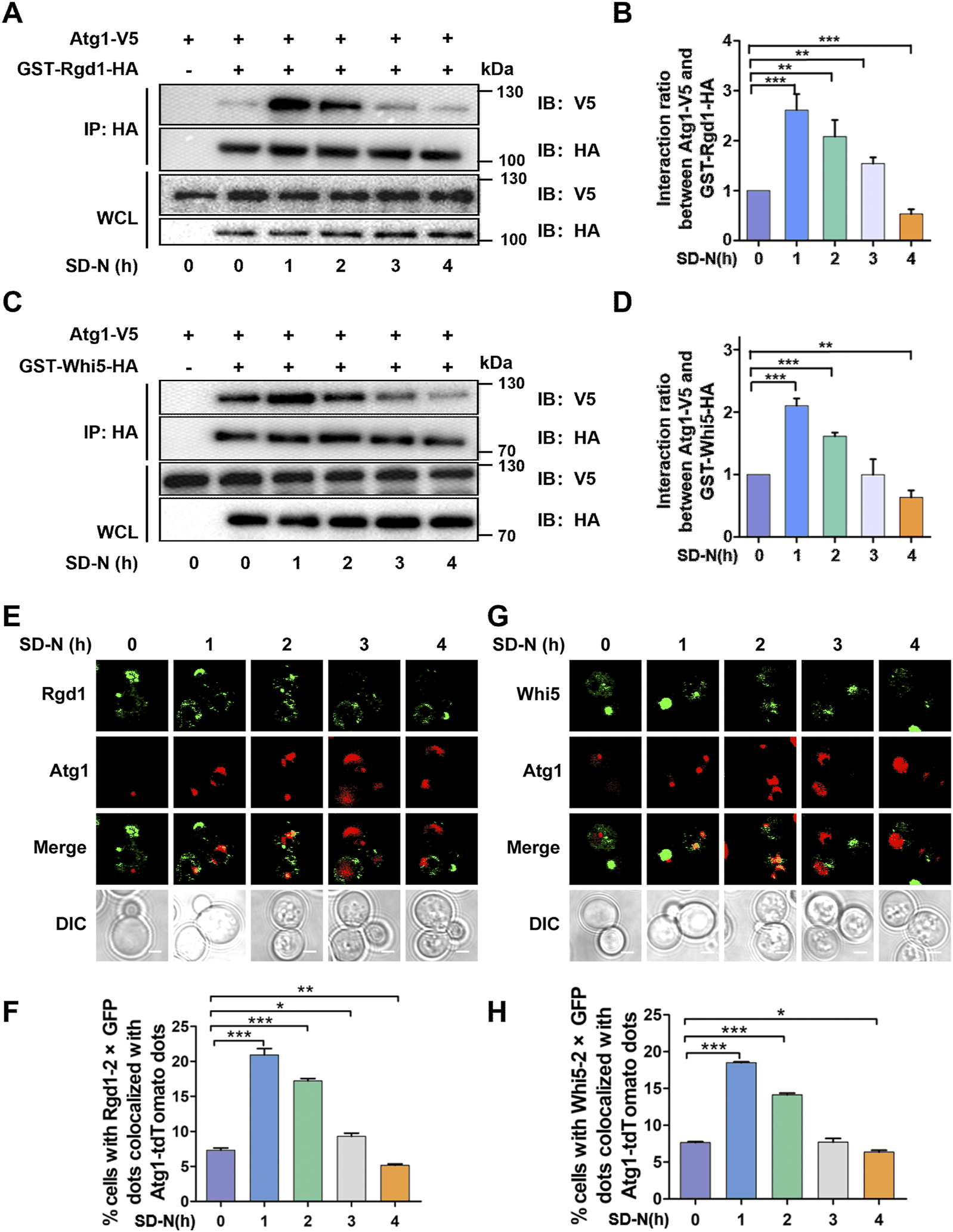 To validate the potential interaction of Atg1 with Rgd1 or Whi5 during autophagy, the cells expressing V5-tagged Atg1 and HA-tagged Rgd1 or HA-tagged Whi5 were generated, and then grown to OD600 = 0.8–1.0 in culture medium supplemented with 2% galactose (Aladdin, G100367) at 30°C overnight. The yeasts were incubated in SD-N medium for 0, 1, 2, 3, and 4 h, respectively. The cell samples were lysed with the protein extraction kit for microbes with thick walls (Minute, YT-015), and cell lysates were incubated with anti-HA agarose beads (Sigma–Aldrich, A2095). The protein immunoprecipitates were separated in SDS-PAGE gel, and finally analyzed with indicated antibodies. The antibody for measuring V5 tag was from Cell signaling (#13202).