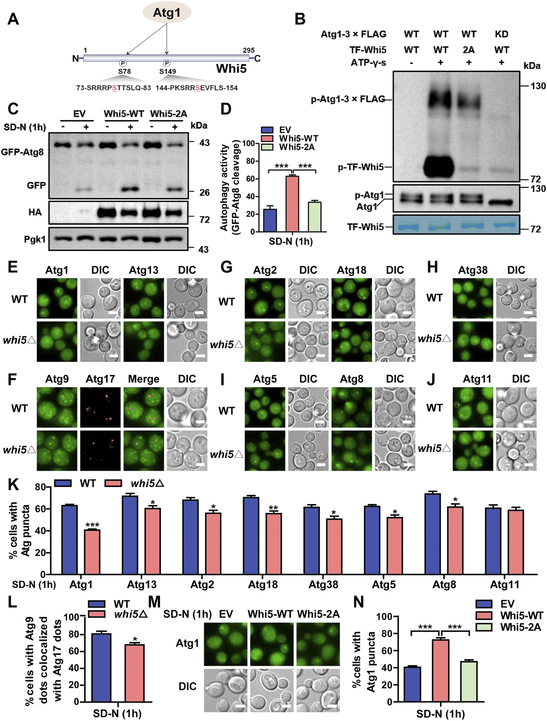 For the construction of the yeast strains BY4741 expressing fluorescent tags, the DNA fragments harboring fluorescent protein GFP were prepared by using restriction enzyme digestion assay, and then separately transformed and integrated into the genome of WT cells and whi5∆ mutants. The yeast cells stably expressing Atg proteins fused with GFP tag were treated with SD-N medium for 1h, and the images of Atg puncta were captured under the inverted fluorescence microscope (Leica, DMI8). For each experiment, the proportions of cells with fluorescent puncta were measured by calculating 300 cells. All experiments were repeatedly performed with three times. The two-sided t-test was used to evaluate the statistical significance (p < 0.05).