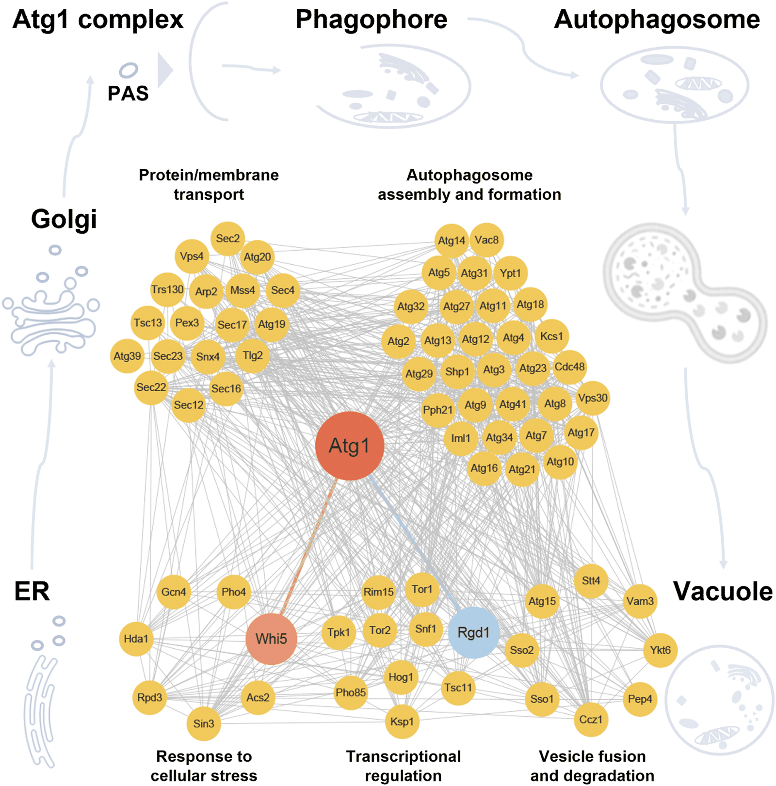 According to the annotations of GO biological processes, the 75 proteins, including 67 known and newly identified Atg1-interacting proteins, as well as 12 additional autophagy effectors influenced by RGD1 or WHI5, were classified into five groups, including response to cellular stress, transcriptional regulation, protein/membrane transport, autophagosome assembly and formation, and vesicle fusion and degradation. Known PPIs among these proteins were integrated from the nine public databases, including BioGRID (Chatr-Aryamontri et al., 2017), DIP (Xenarios et al., 2002), HINT (Das and Yu, 2012), IID (Kotlyar et al., 2019), IntAct (Kerrien et al., 2012), iRefIndex (Razick et al., 2008), Mentha (Calderone et al., 2013), MINT (Licata et al., 2012) and STRING (Szklarczyk et al., 2021). Potential Atg1 substrates were computationally predicted, using our previously developed GPS algorithm (Xue et al., 2008; Wang et al., 2020). In total, we extracted 682 PPIs for the 75 proteins, and the Atg1-centered regulatory network was constructed and visualized with Cytoscape 3.6.1 software package (Shannon et al., 2003).