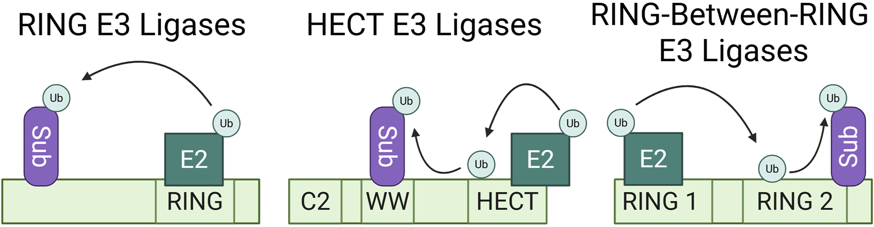 The three most characterized families of E3 ligases are distinguished by their catalytic mechanism of ubiquitin ligation (Figure 1). Really Interesting New Gene (RING) E3 ligases act as scaffolds for E2s by either forming a Zn2+ ion cross brace or through binding of the U-box and facilitating direct ubiquitin transfer to proximal substrates. Homologous to E6-AP C-terminus (HECT) family E3 ligases use a two-step process in which the HECT E3 first acts as a linker to accept the ubiquitin from the E2 onto a catalytic cysteine residue in the HECT domain and later catalyzes the transfer of the ubiquitin to the substrate lysine through a thioester bond (Kim et al., 2011; Metzger et al., 2014). In some cases, this requires a conformational change to expose the accepting cysteine. Lastly, RING-between-RING (RBR) family mechanism of catalysis shares elements of both the RING and HECT families; the RING domain binds the E2 similarly to the RING E3s, but this binding is in turn used to stabilize the transfer of the ubiquitin from the E2 to the catalytic domain of the RBR, which then transfers the ubiquitin to the substrate in an aminolysis reaction reminiscent of that of HECT E3 ligases (Wang et al., 2023). Each of these large families of E3s can be further stratified into subfamilies based on differences in substrate binding domains and catalytic domains. In addition to the major families, the recent discovery of the RING-Cysteine-Relay (Pao et al., 2018), ATP-dependent RZ finger (Ahel et al., 2021; Otten et al., 2021), and CRL-RBR-E3 (Horn-Ghetko et al., 2021) classes of E3 ligases have expanded understanding of ubiquitination mechanisms.