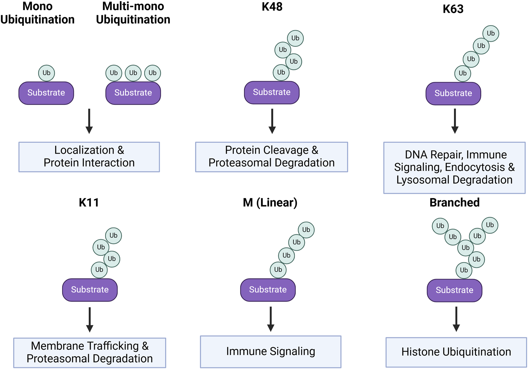 Ubiquitin linkages and substrate protein fates. Protein fates based on their ubiquitin linkage. Mono and multi-mono ubiquitination is when a single ubiquitin is conjugated to the substrate, rather than a chain. This form of ubiquitination generally alters the substrate localization or protein-protein interactions. These are also more transient post-translational modifications. K48, K63, K11, M, and Branched are all linkages in which chains of ubiquitin are conjugated onto the substrate. Chains linked at K48 result in protein cleavage and/or target the protein for proteasomal degradation. K63 ubiquitin chains have myriad effects including roles in DNA repair, immunity, endocytosis, and lysosomal degradation. K11 linkages result in changes in protein membrane trafficking and proteasomal degradation. M linkages occur at the N-terminal methionine of the protein and are associated with immune signaling. Lastly, branched ubiquitin chains are associated with histone ubiquitination.