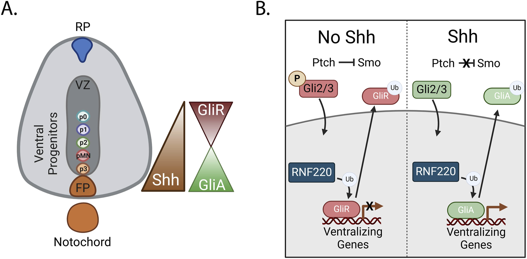 Sonic hedgehog (Shh) is an important morphogen in neural specification. After neurulation, Shh is expressed in both the notochord and the floorplate of the emerging spinal cord, producing a gradient along the dorsal-ventral axis, with Shh expression highest ventrally (Dessaud et al., 2008). Shh signaling and the dynamic activation and repression of its targets by Gli transcription factors (TFs), contributes to the expression of distinct and restricted patterns of ventralizing genes defining medial populations of ventral neuronal progenitors including the most ventral floorplate, p3, pMN, and least ventral, p2-p0 domains (Figure 3A). In later stages of spinal cord development, these progenitors give rise to interneurons, glial cells, and motor neurons (Lu et al., 2015; Ravanelli and Appel, 2015). Recent data implicates Ring Finger Protein 220 (RNF220), a highly conserved RING E3 ligase, in the tuning of Shh signaling and subsequent specification of ventral progenitor fates in the neural tube (Ma and Mao, 2022).